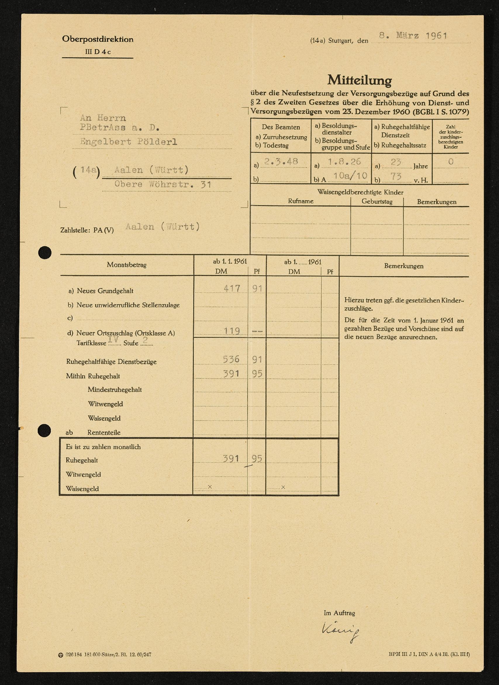 | Beschreibung | Mittelung über Neufestsetzung der Versorgungsbezüge , Postbetriebsassistent a.D. Engelbert Pölderl, Oberpostdirektion, Stuttart, 8. März 1961 |