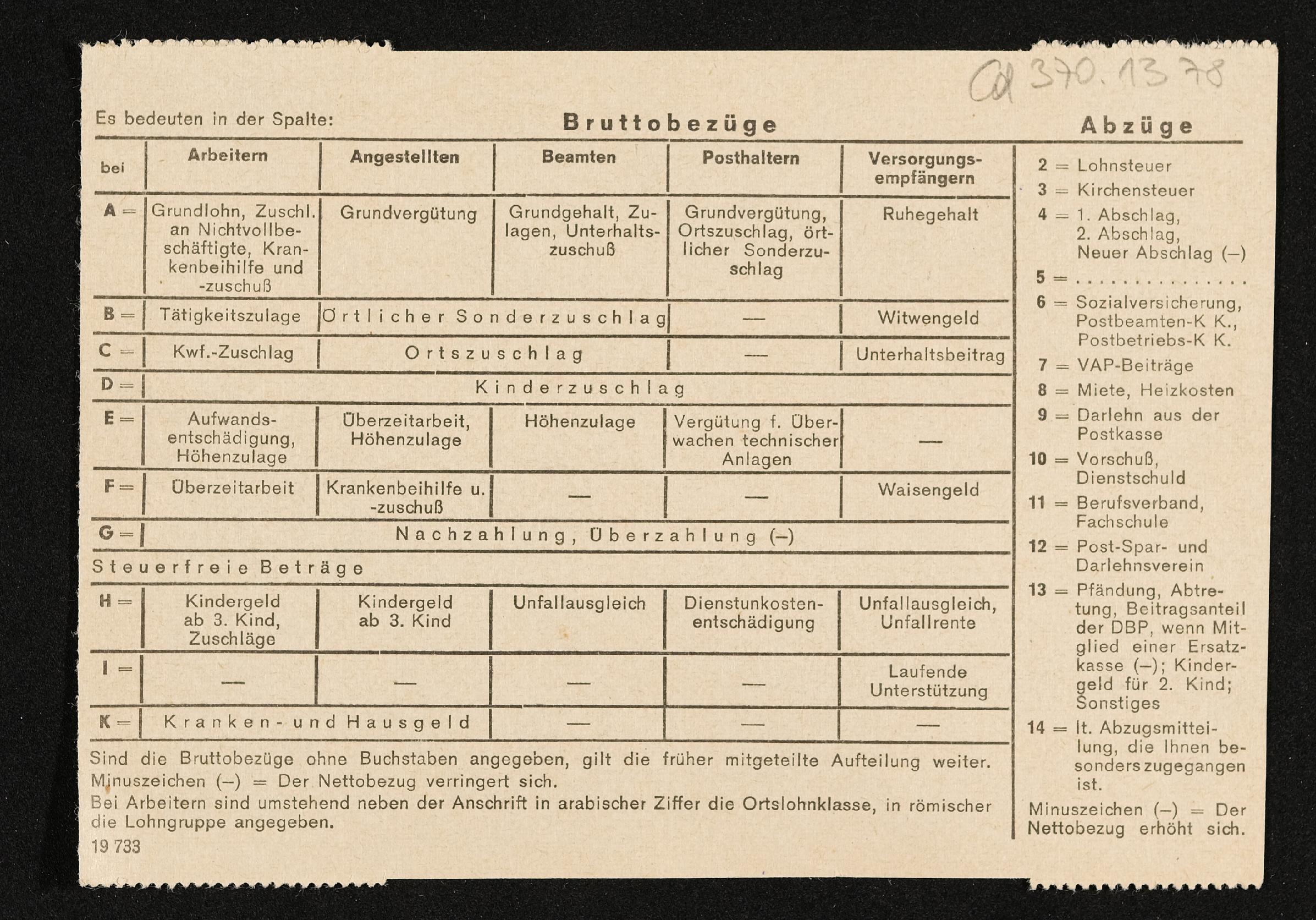 | Beschreibung | Lohnzettel, Postbetriebsassistent Engelbert Pölderl, Oberpostdirektion Stuttgart, Februar 1964 |