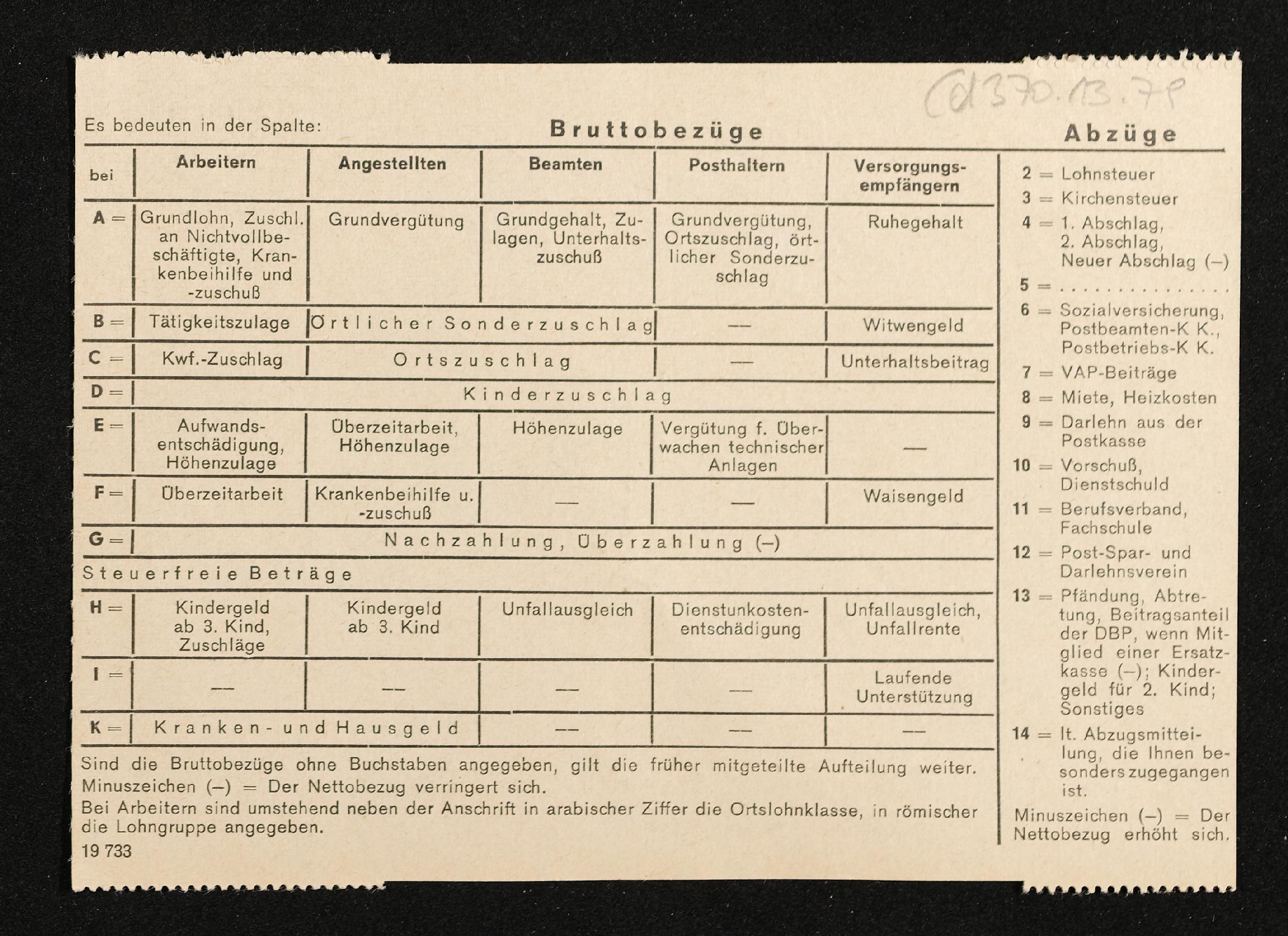 | Beschreibung | Lohnzettel, Postbetriebsassistent Engelbert Pölderl, Oberpostdirektion Stuttgart, Jänner 1964 |