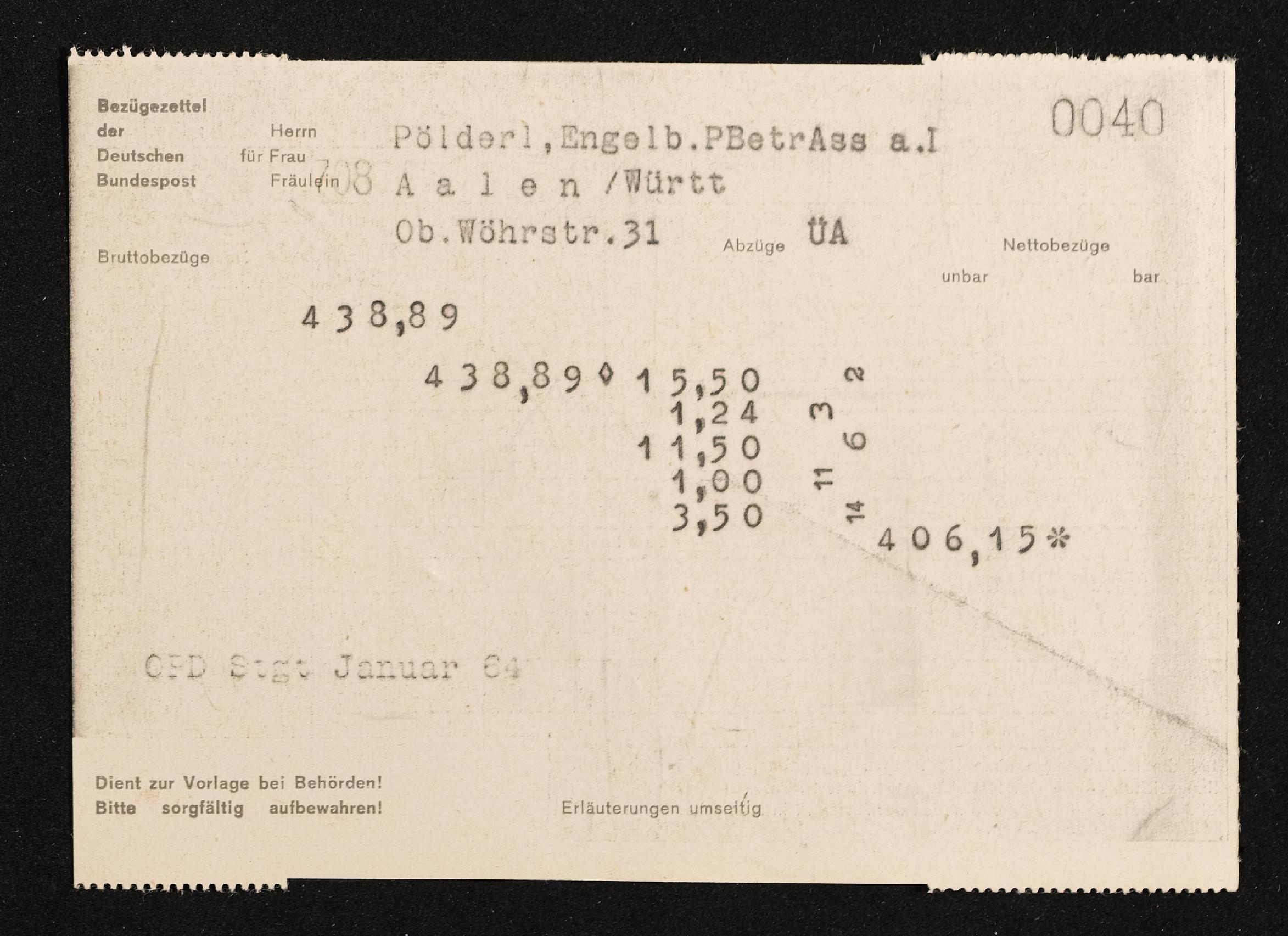 | Beschreibung | Lohnzettel, Postbetriebsassistent Engelbert Pölderl, Oberpostdirektion Stuttgart, Jänner 1964 |