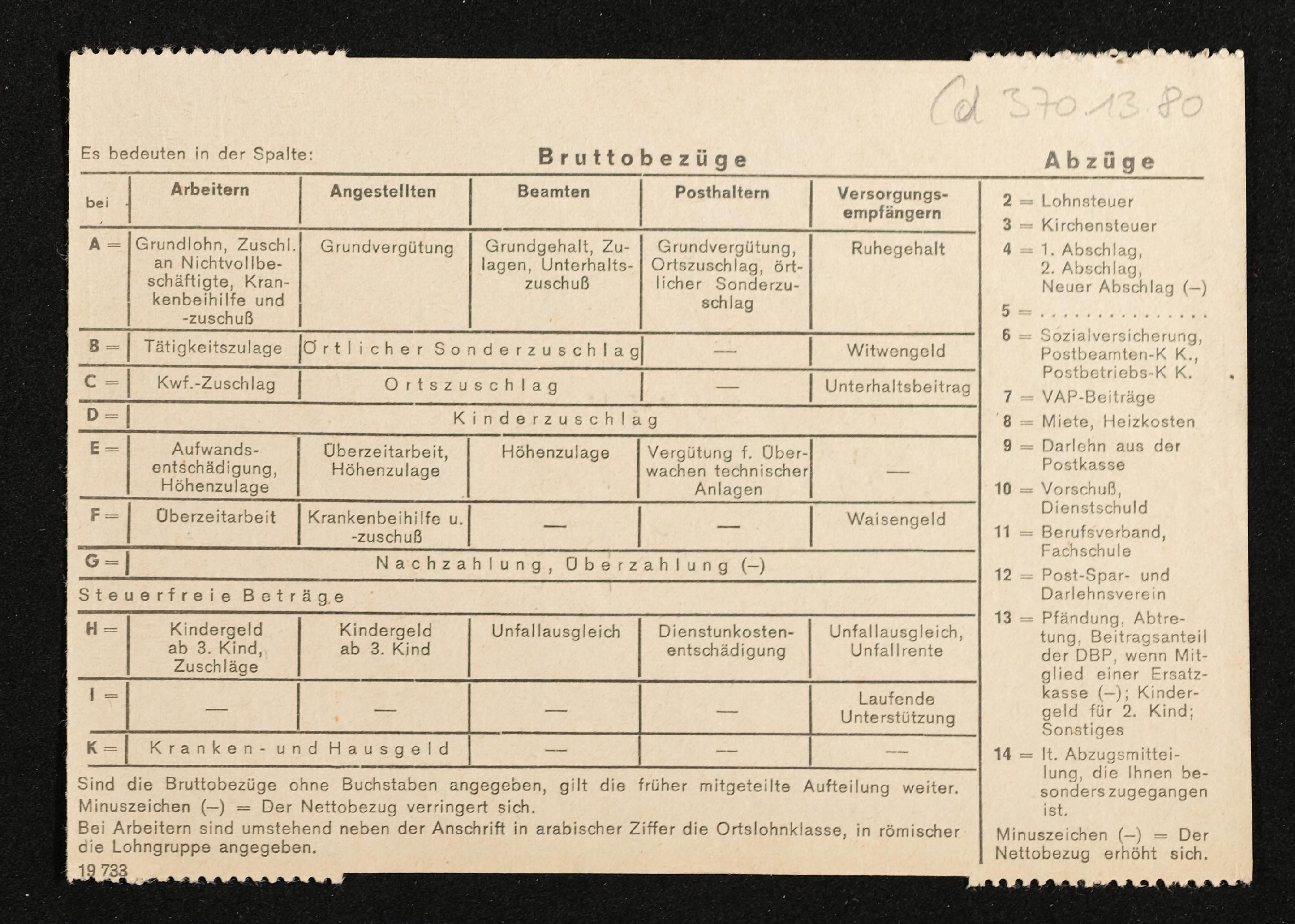| Beschreibung | Lohnzettel, Postbetriebsassistent Engelbert Pölderl, Oberpostdirektion Stuttgart, Dezember 1963 |