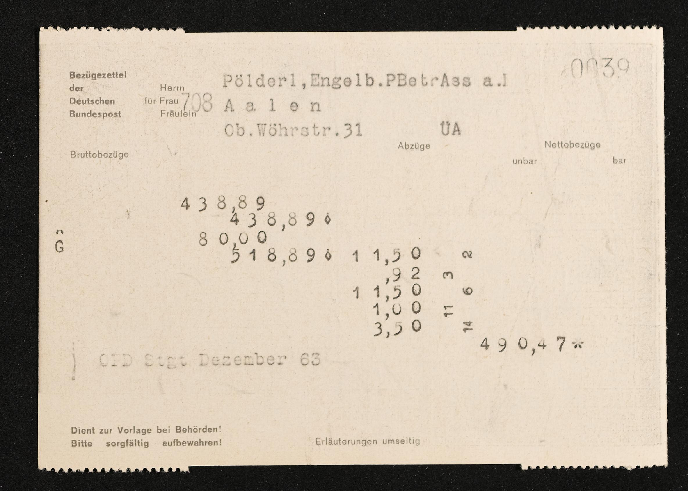 | Beschreibung | Lohnzettel, Postbetriebsassistent Engelbert Pölderl, Oberpostdirektion Stuttgart, Dezember 1963 |
