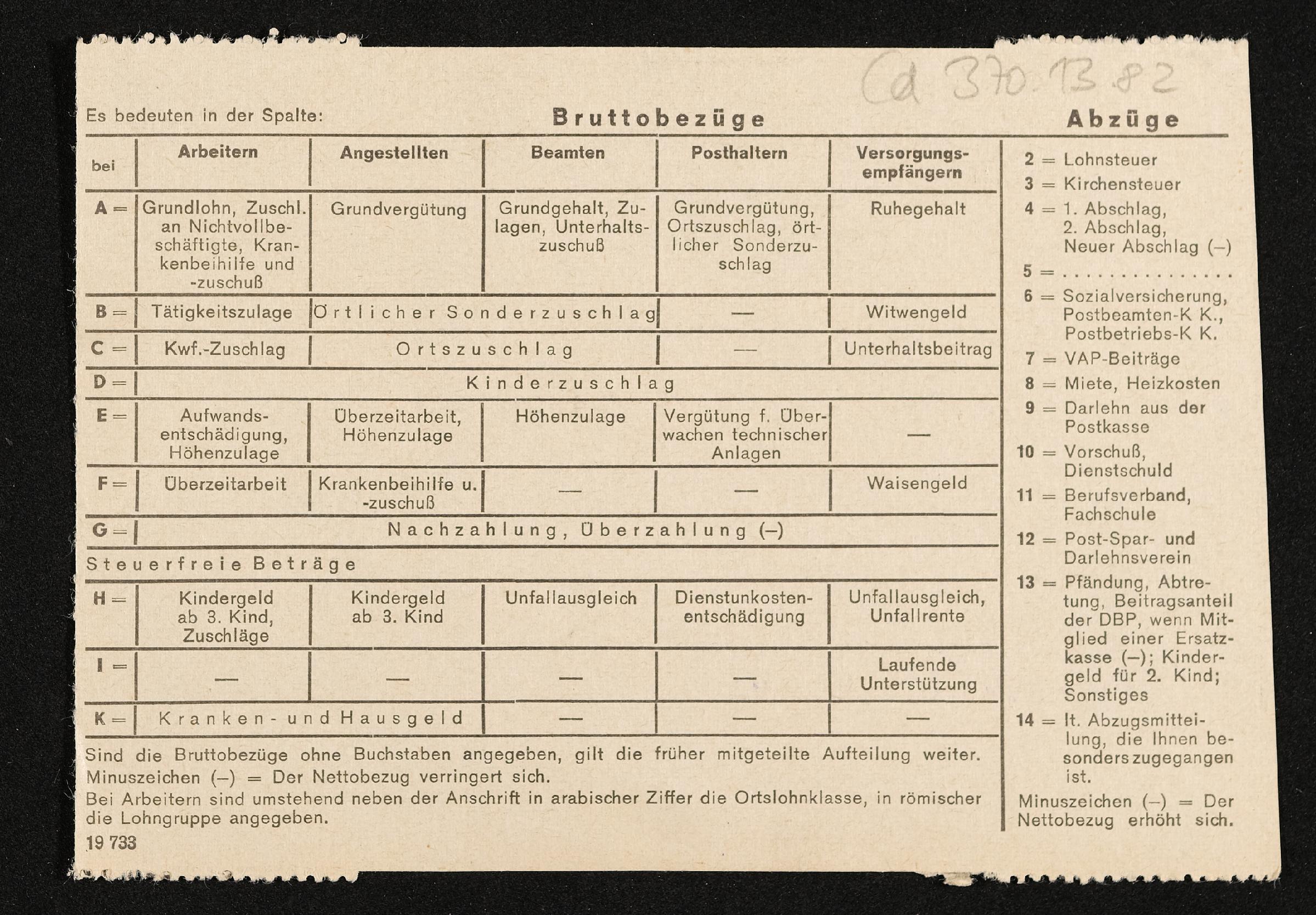 | Beschreibung | Lohnzettel, Postbetriebsassistent Engelbert Pölderl, Oberpostdirektion Stuttgart, Oktober 1963 |