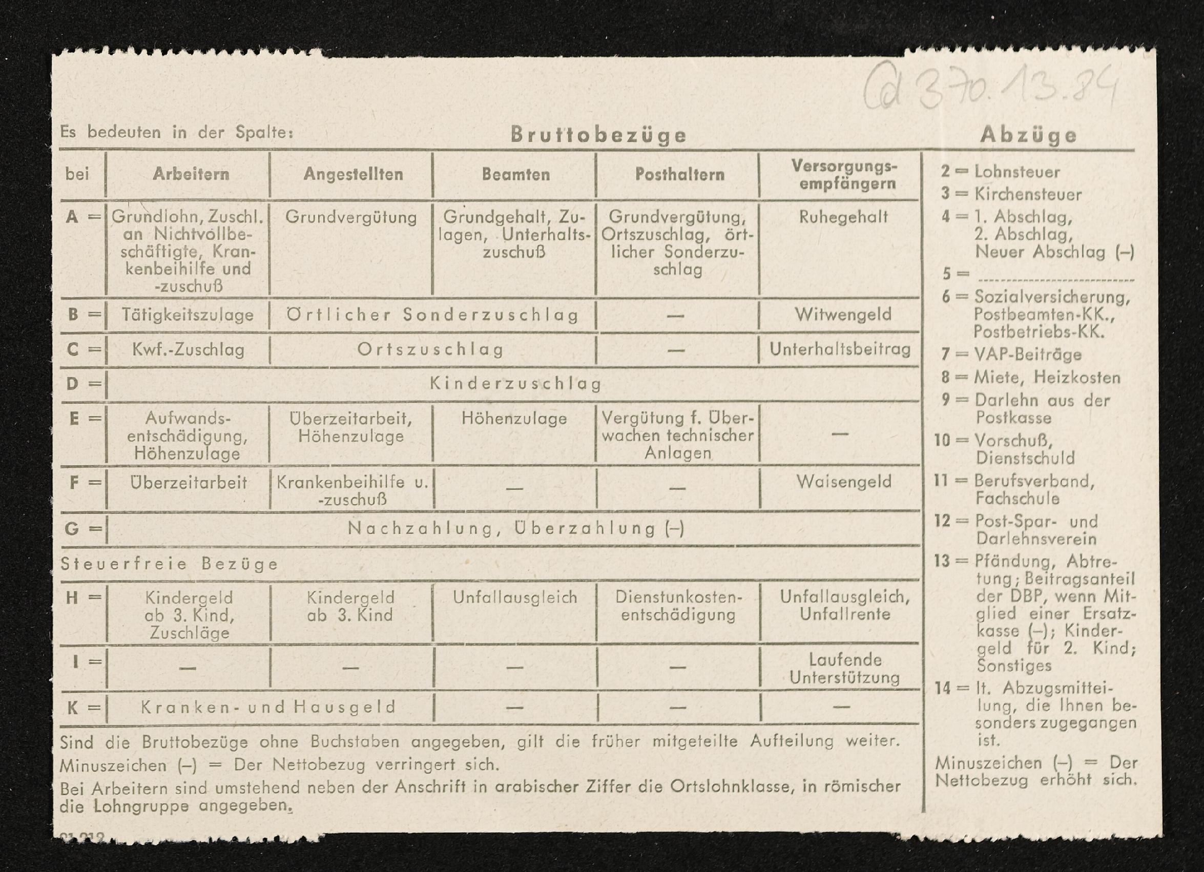 | Beschreibung | Lohnzettel, Postbetriebsassistent Engelbert Pölderl, Oberpostdirektion Stuttgart, August 1963 |