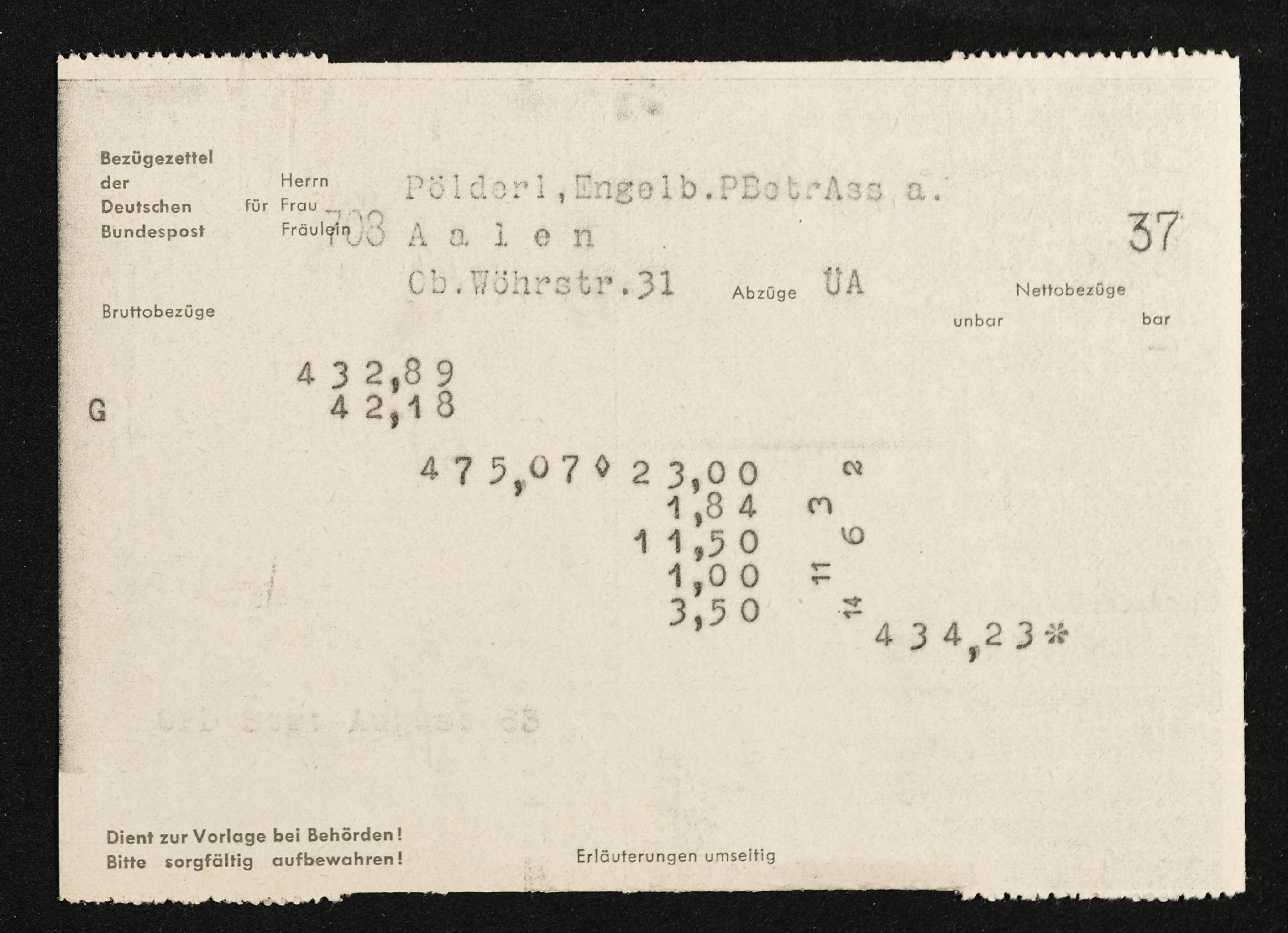 | Beschreibung | Lohnzettel, Postbetriebsassistent Engelbert Pölderl, Oberpostdirektion Stuttgart, August 1963 |