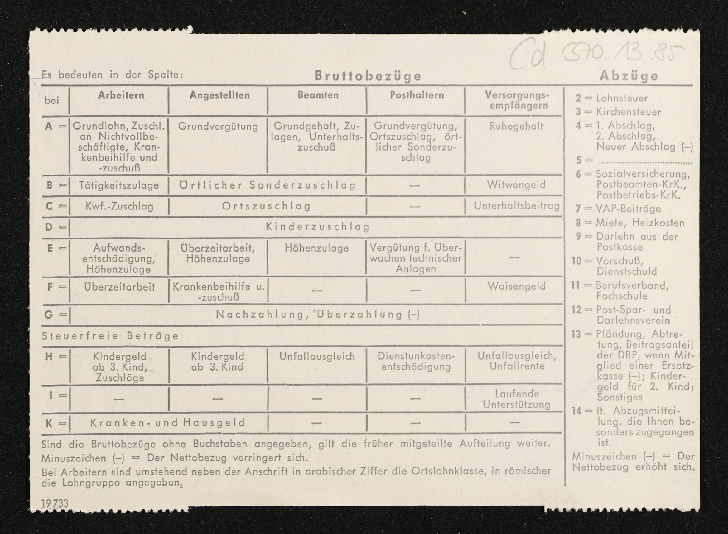 | Beschreibung | Lohnzettel, Postbetriebsassistent Engelbert Pölderl, Oberpostdirektion Stuttgart, Juli 1963 |