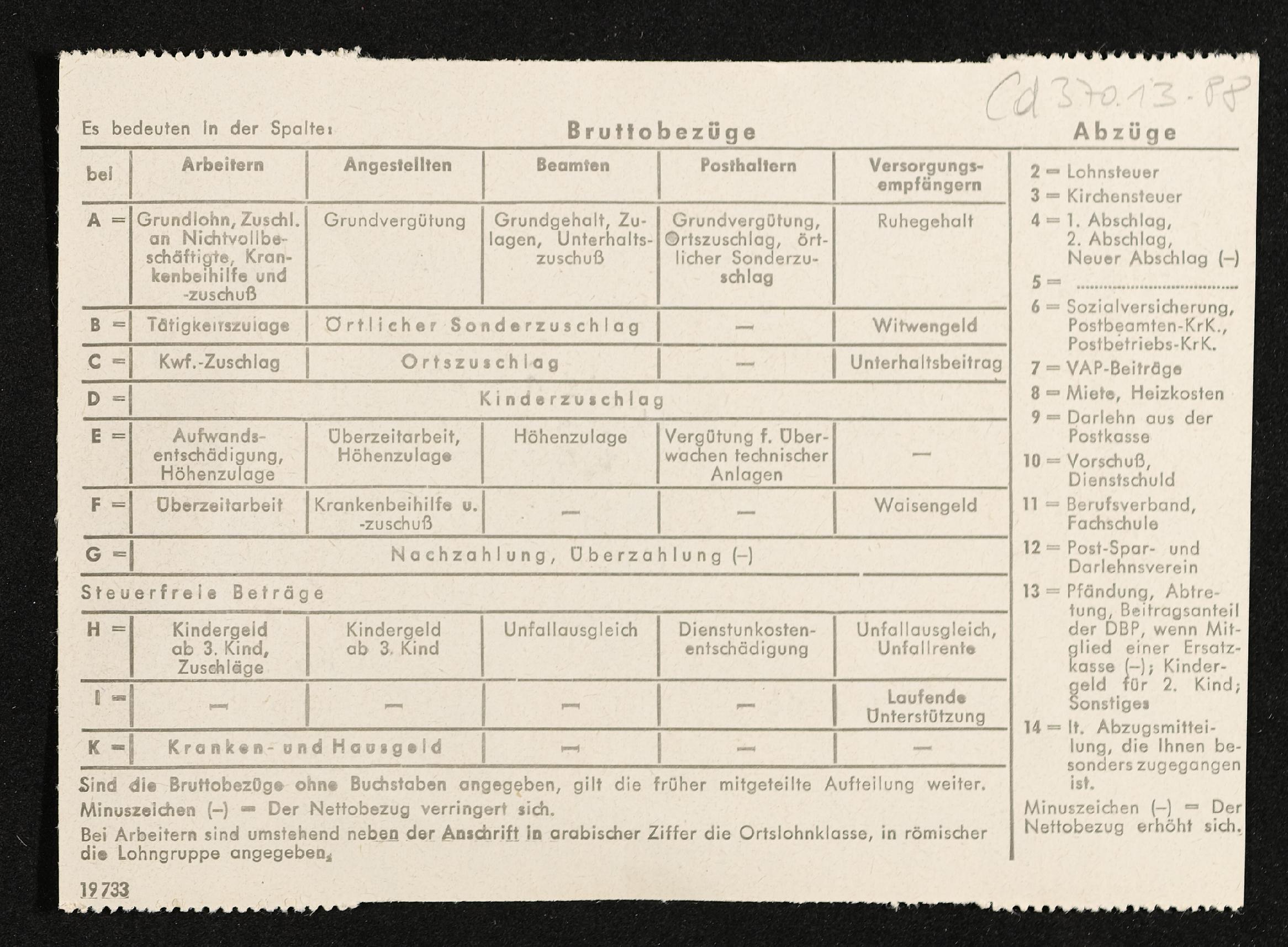 | Beschreibung | Lohnzettel, Postbetriebsassistent Engelbert Pölderl, Oberpostdirektion Stuttgart, April 1963 |