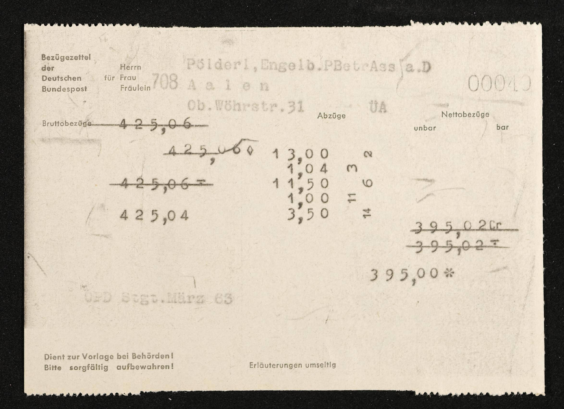 | Beschreibung | Lohnzettel, Postbetriebsassistent Engelbert Pölderl, Oberpostdirektion Stuttgart, März 1963 |