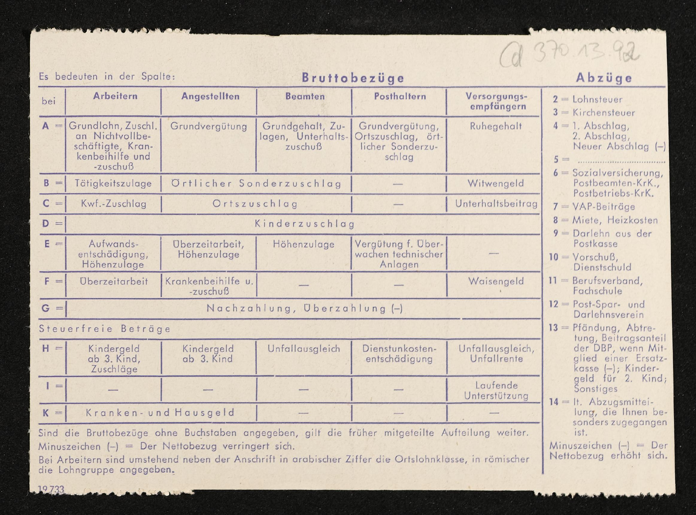 | Beschreibung | Lohnzettel, Postbetriebsassistent Engelbert Pölderl, Überbrückungszulage, Oberpostdirektion Stuttgart, Dezember 1962 |
