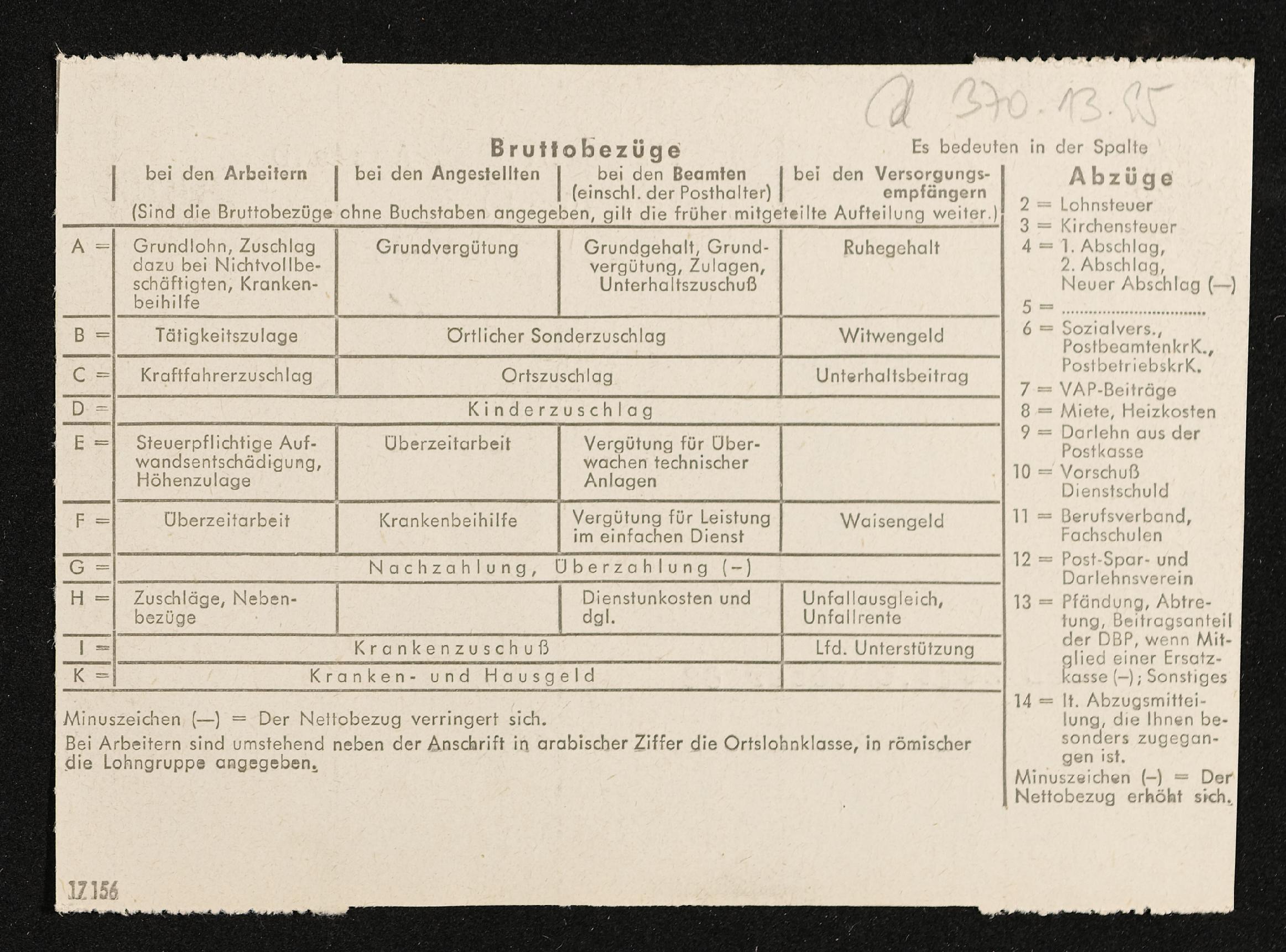 | Beschreibung | Lohnzettel, Postbetriebsassistent Engelbert Pölderl, Oberpostdirektion Stuttgart, Oktober 1962 |