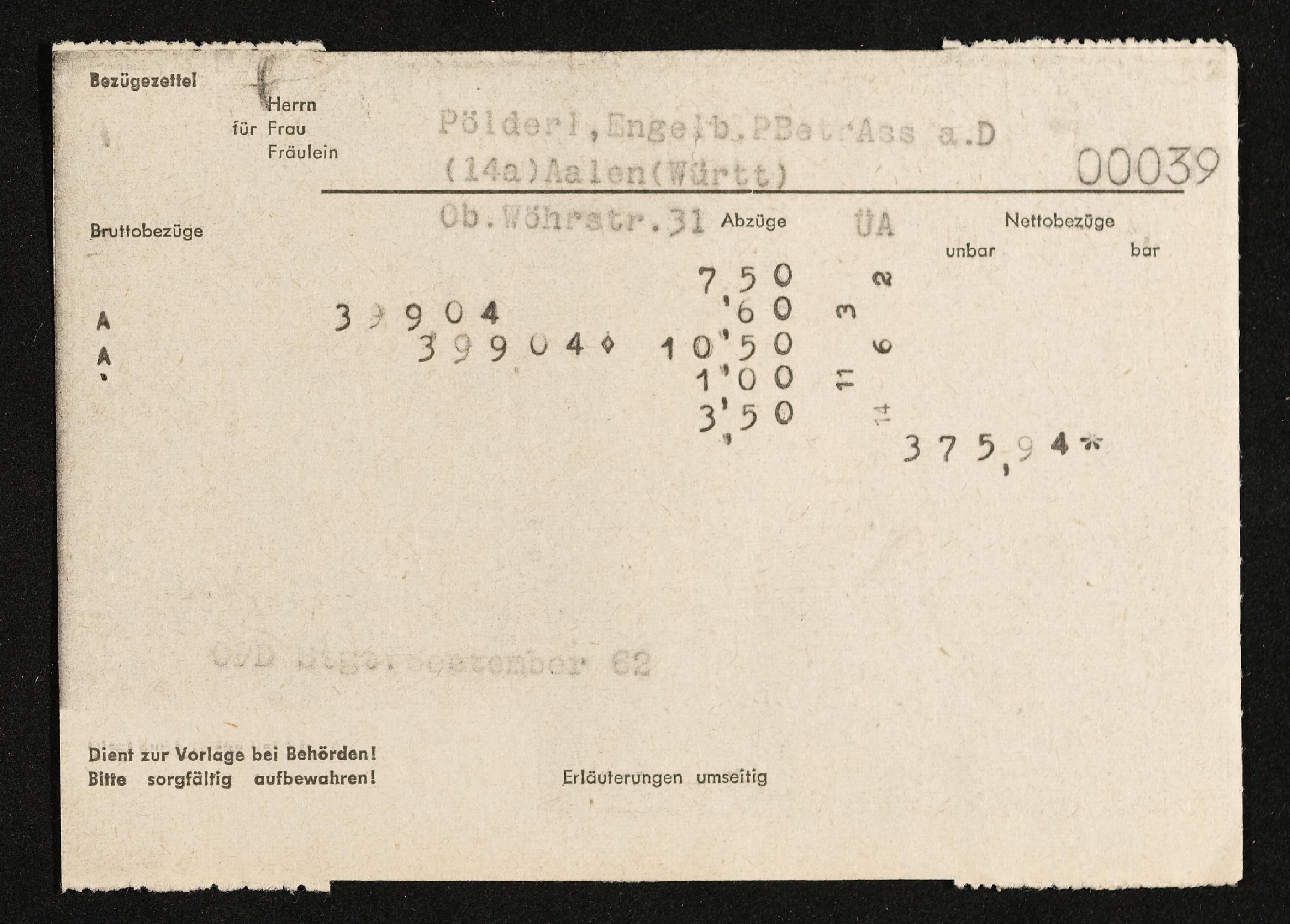 | Beschreibung | Lohnzettel, Postbetriebsassistent Engelbert Pölderl, Oberpostdirektion Stuttgart, September 1962 |
