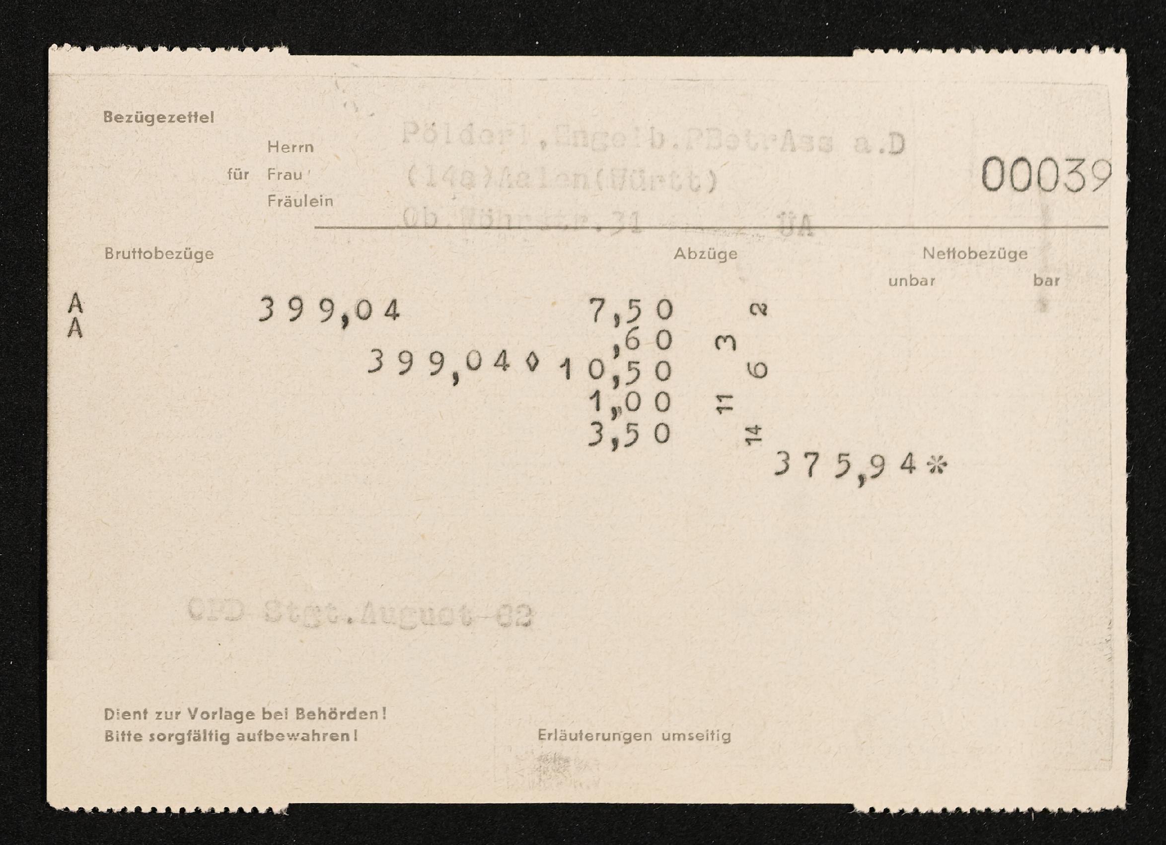 | Beschreibung | Lohnzettel, Postbetriebsassistent Engelbert Pölderl, Oberpostdirektion Stuttgart, August 1962 |
