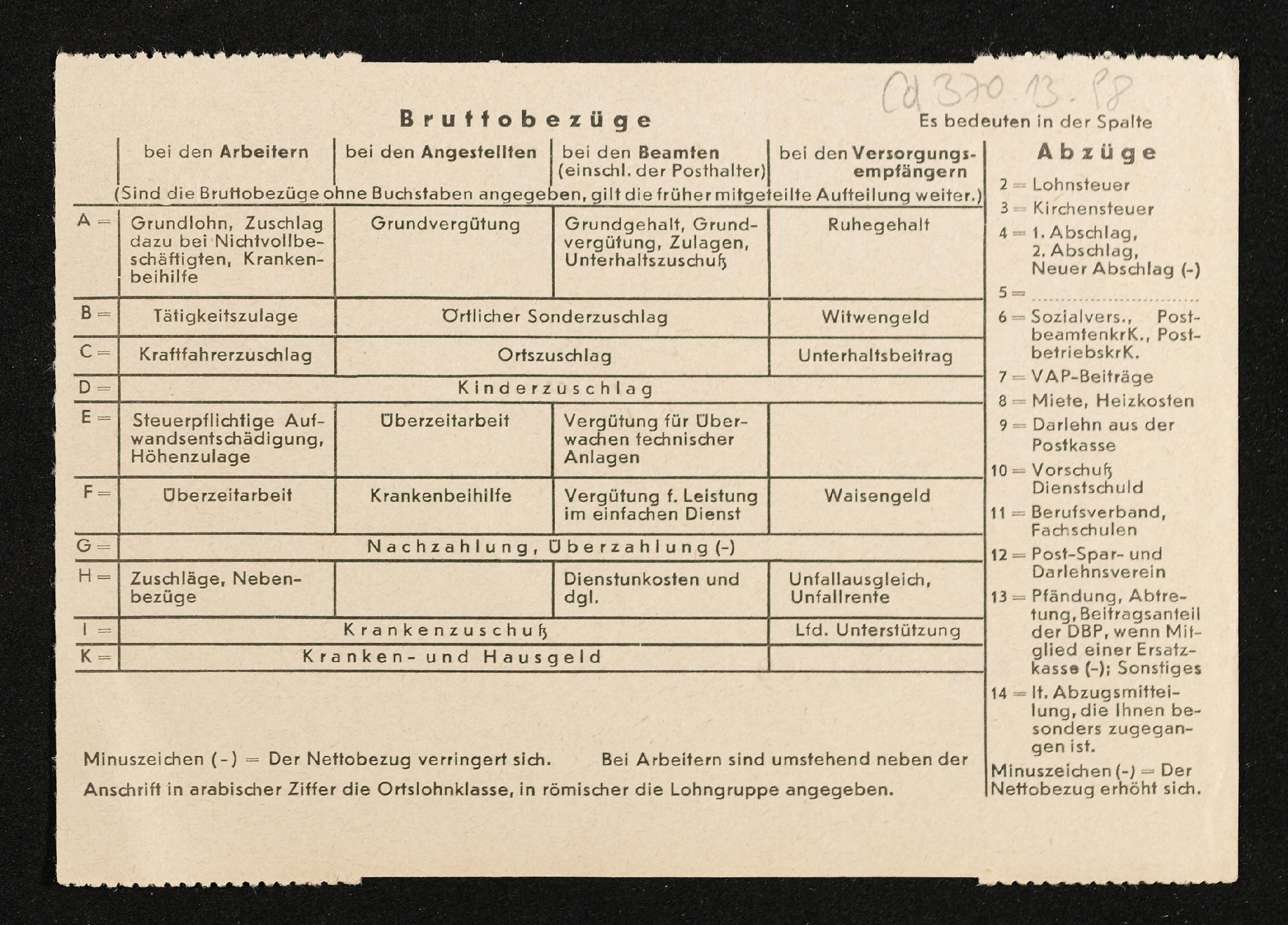 | Beschreibung | Lohnzettel, Postbetriebsassistent Engelbert Pölderl, Oberpostdirektion Stuttgart, Juli 1962 |