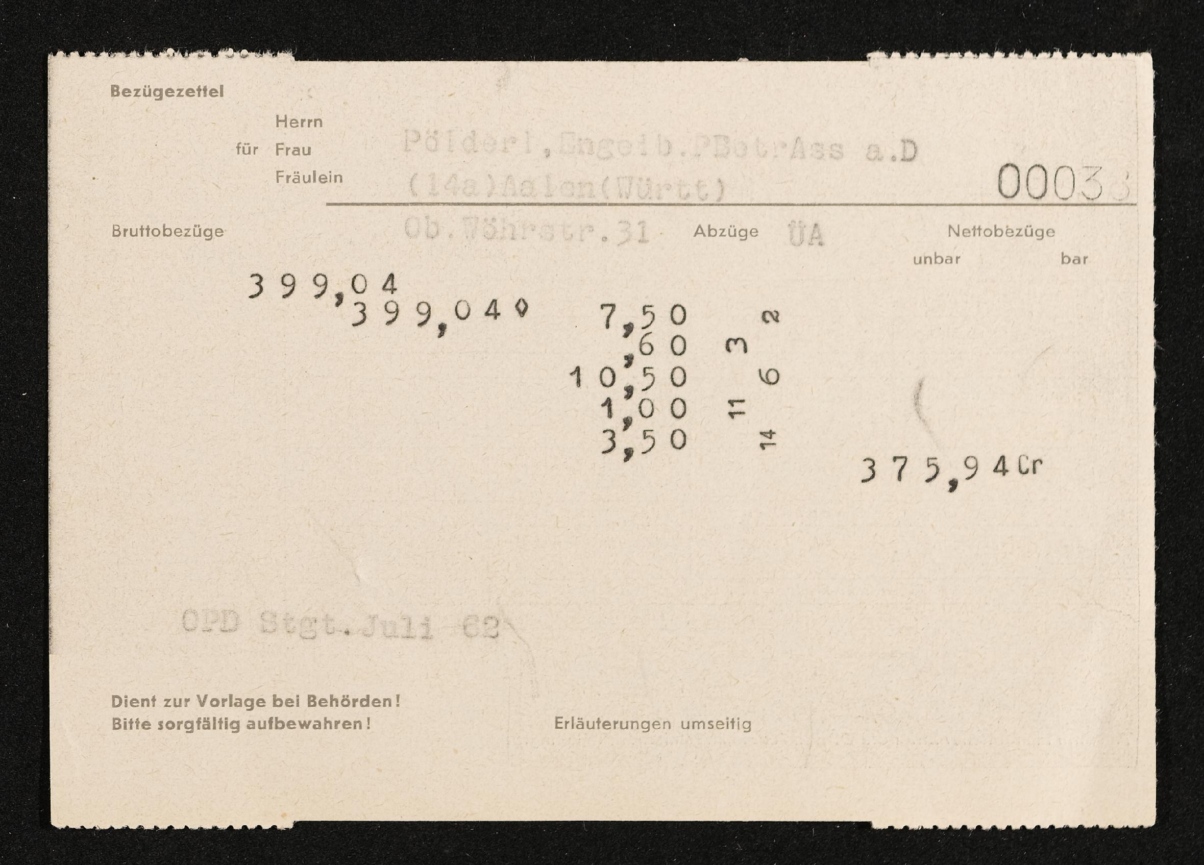 | Beschreibung | Lohnzettel, Postbetriebsassistent Engelbert Pölderl, Oberpostdirektion Stuttgart, Juli 1962 |