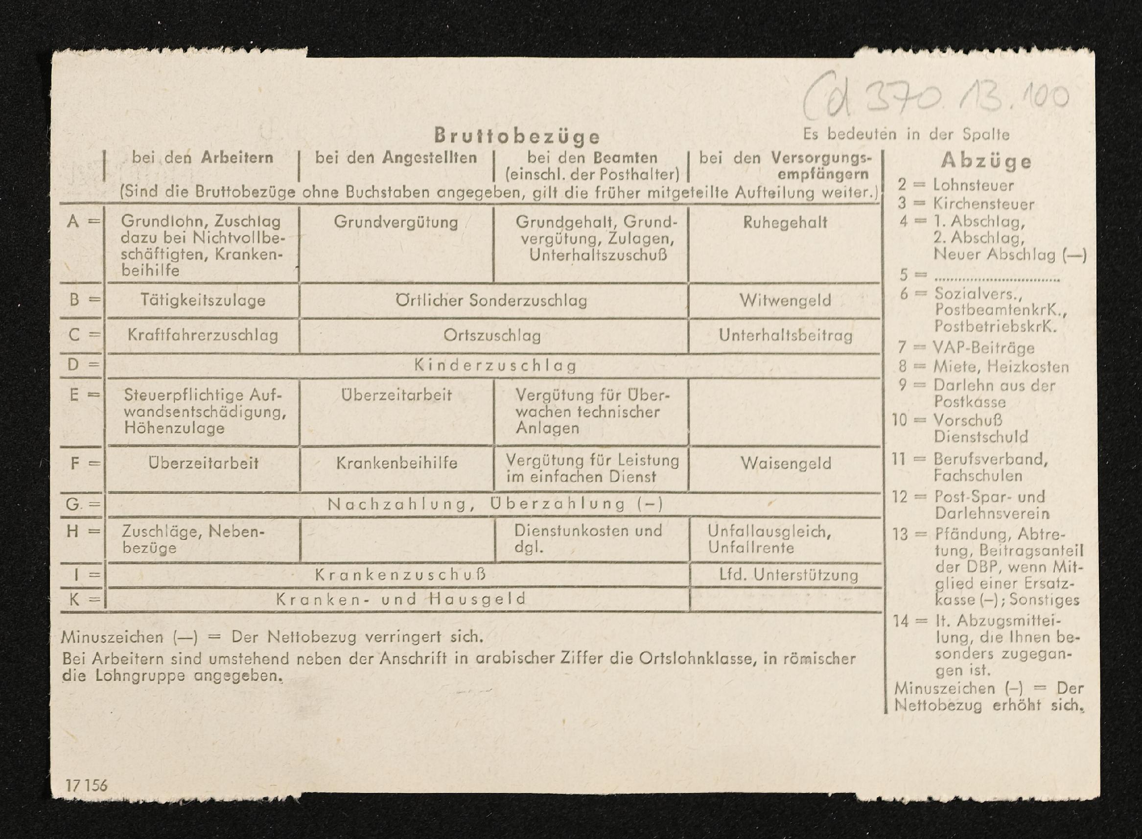 | Beschreibung | Lohnzettel, Postbetriebsassistent Engelbert Pölderl, Oberpostdirektion Stuttgart, Juni 1962 |