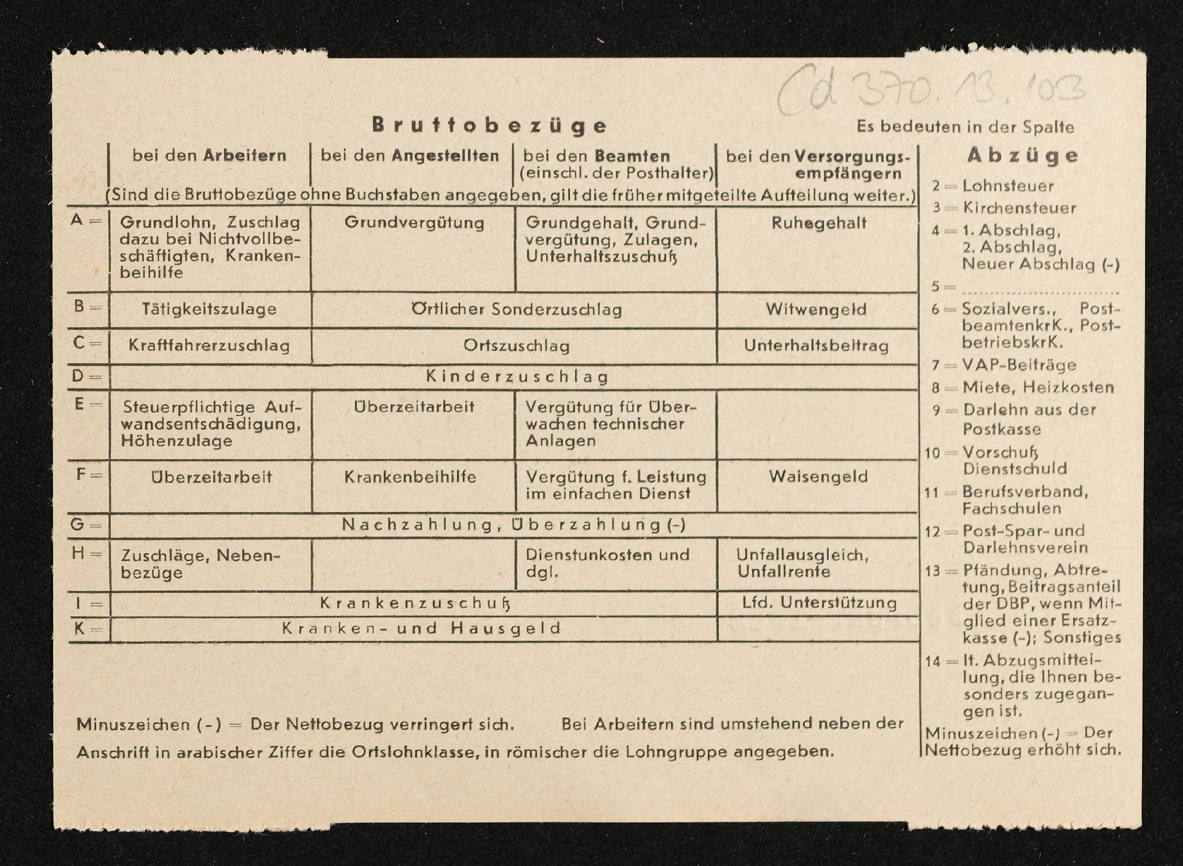 | Beschreibung | Lohnzettel, Postbetriebsassistent Engelbert Pölderl, Oberpostdirektion Stuttgart, Februar 1962 |
