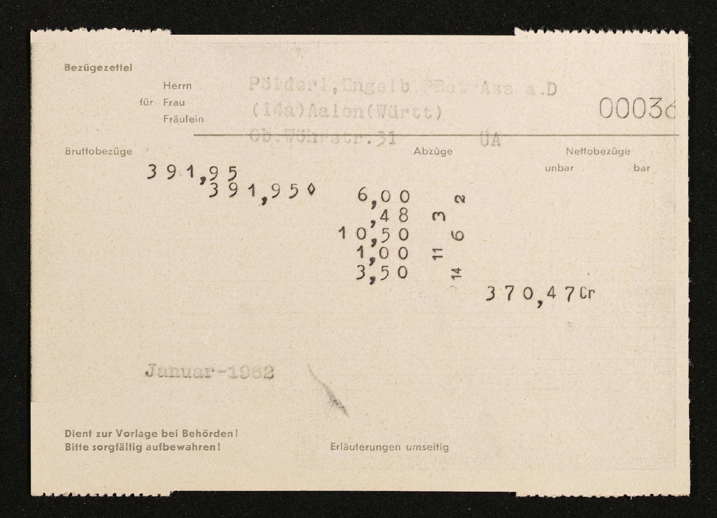 | Beschreibung | Lohnzettel, Postbetriebsassistent Engelbert Pölderl, Oberpostdirektion Stuttgart, Jänner 1962 |