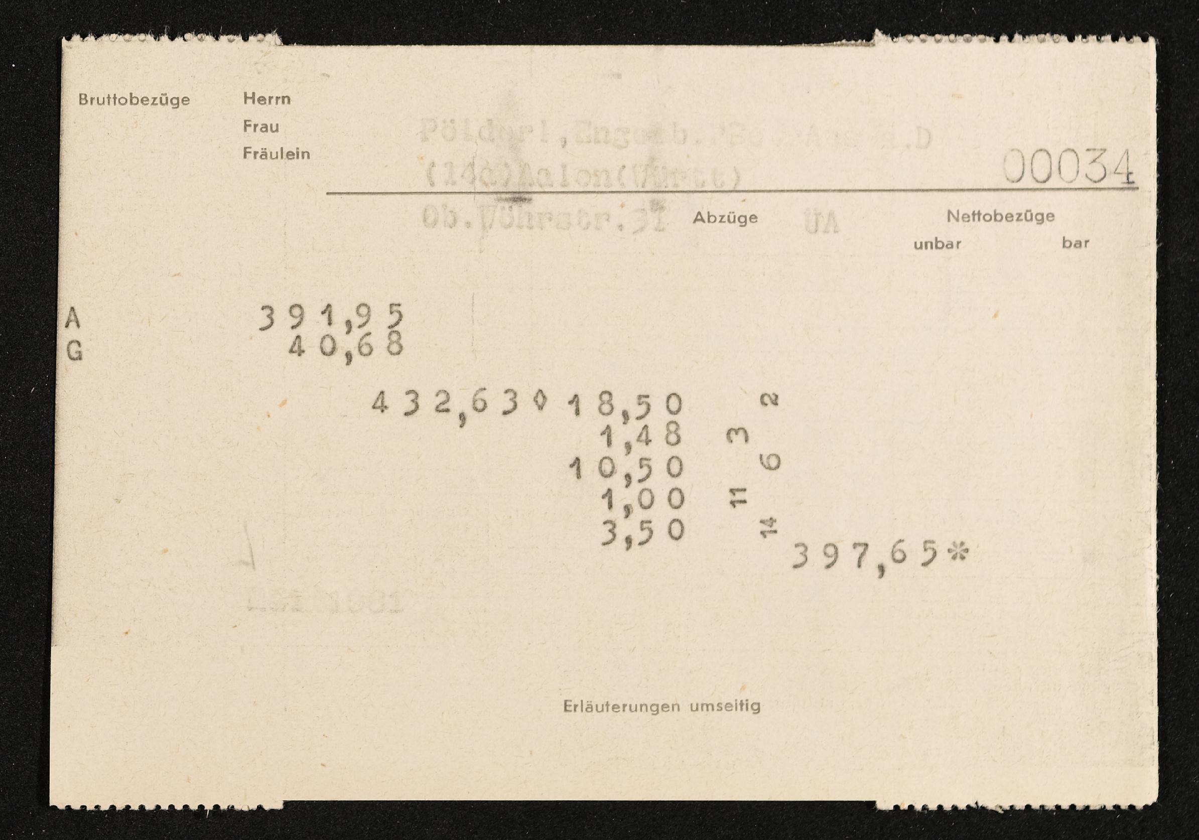 | Beschreibung | Lohnzettel, Postbetriebsassistent Engelbert Pölderl, Oberpostdirektion Stuttgart, Mai 1961 |
