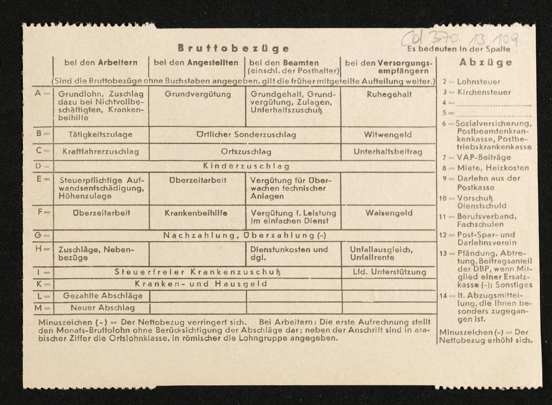 | Beschreibung | Lohnzettel, Postbetriebsassistent Engelbert Pölderl, Oberpostdirektion Stuttgart, Juni 1961 |