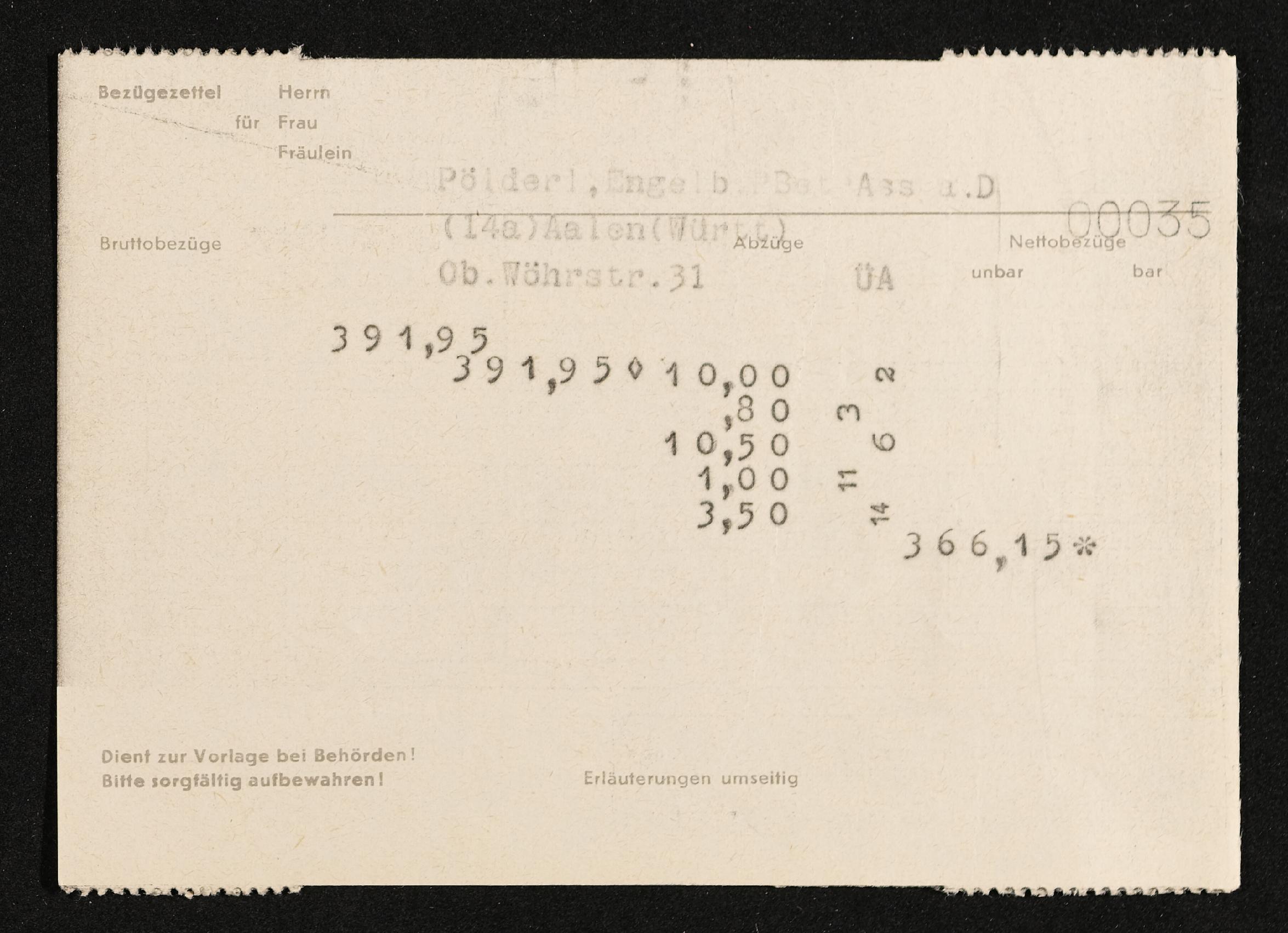 | Beschreibung | Lohnzettel, Postbetriebsassistent Engelbert Pölderl, Oberpostdirektion Stuttgart, Juli 1961 |