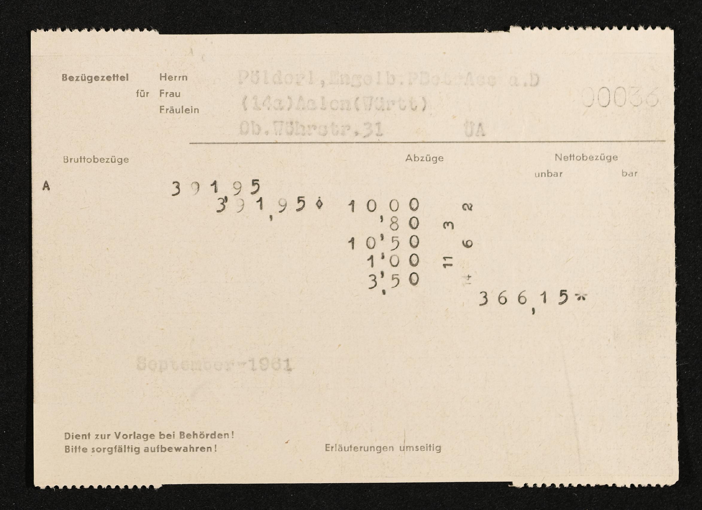 | Beschreibung | Lohnzettel, Postbetriebsassistent Engelbert Pölderl, Oberpostdirektion Stuttgart, September 1961 |