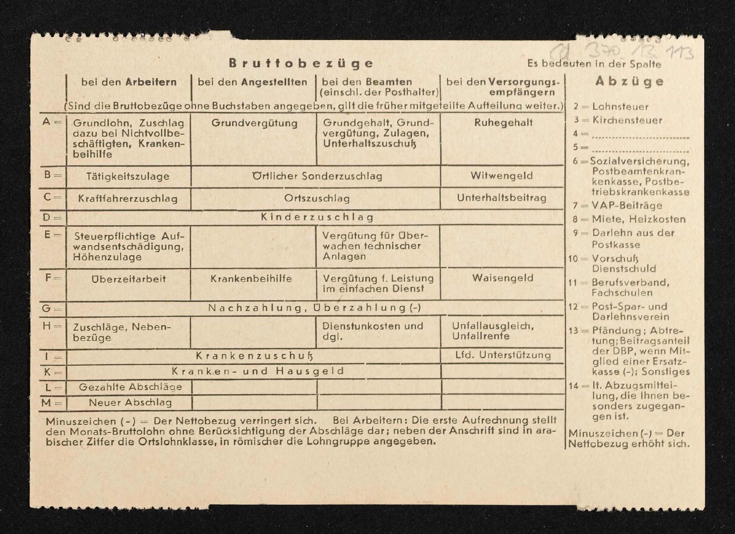 | Beschreibung | Lohnzettel, Postbetriebsassistent Engelbert Pölderl, Oberpostdirektion Stuttgart, April 1961 |
