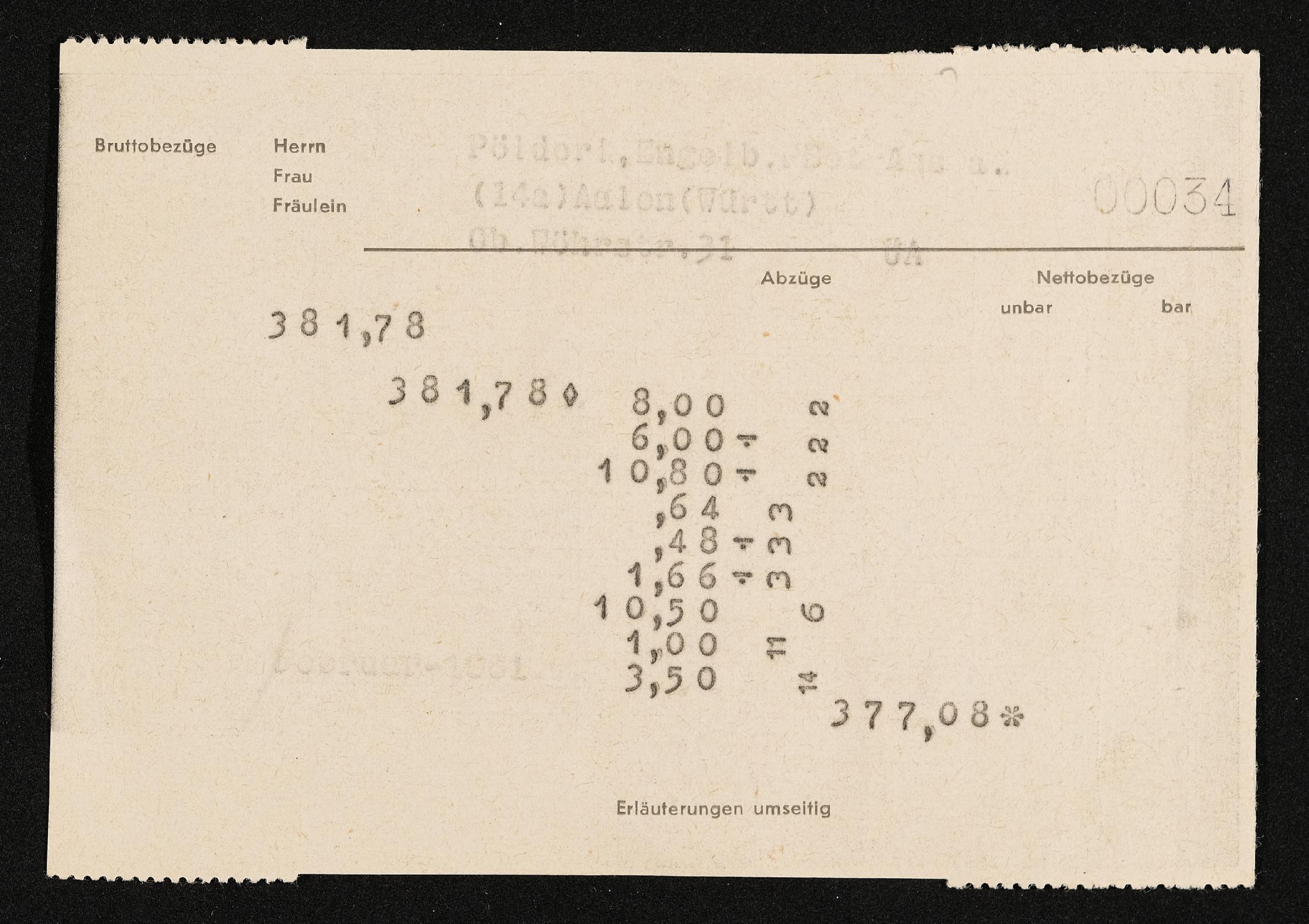 | Beschreibung | Lohnzettel, Postbetriebsassistent Engelbert Pölderl, Oberpostdirektion Stuttgart, Februar 1961 |