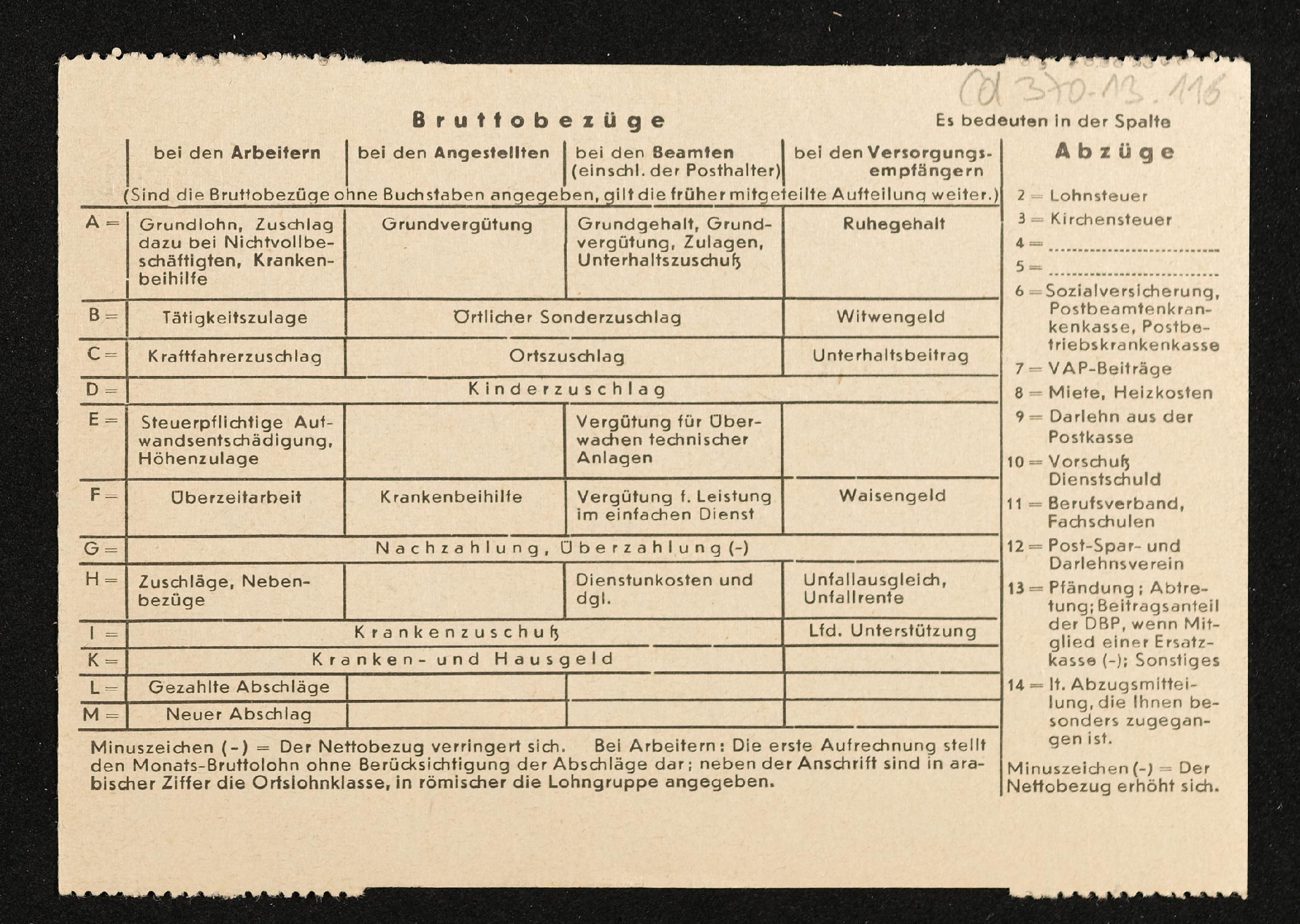| Beschreibung | Lohnzettel, Postbetriebsassistent Engelbert Pölderl, Oberpostdirektion Stuttgart, Jänner 1961 |