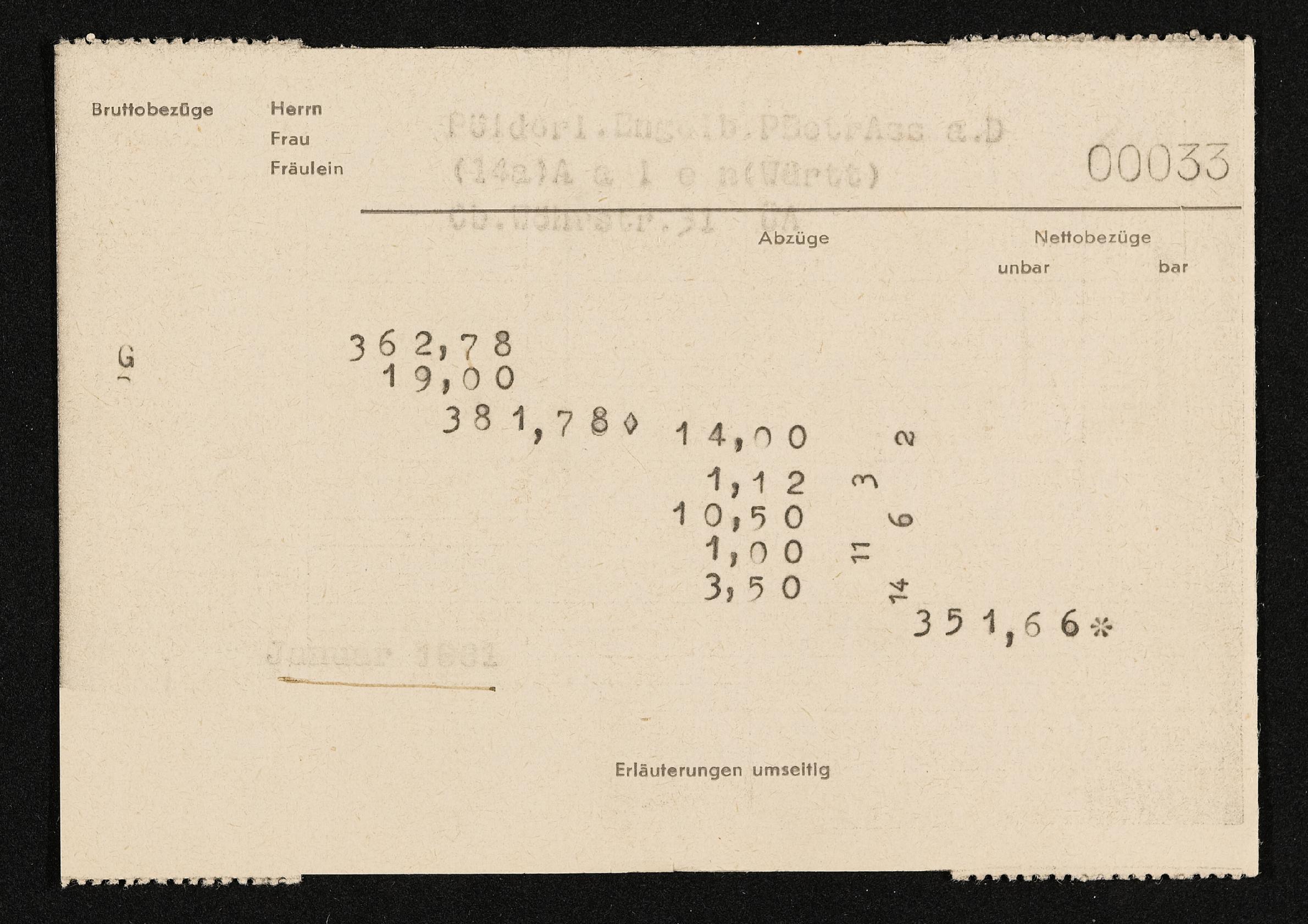 | Beschreibung | Lohnzettel, Postbetriebsassistent Engelbert Pölderl, Oberpostdirektion Stuttgart, Jänner 1961 |