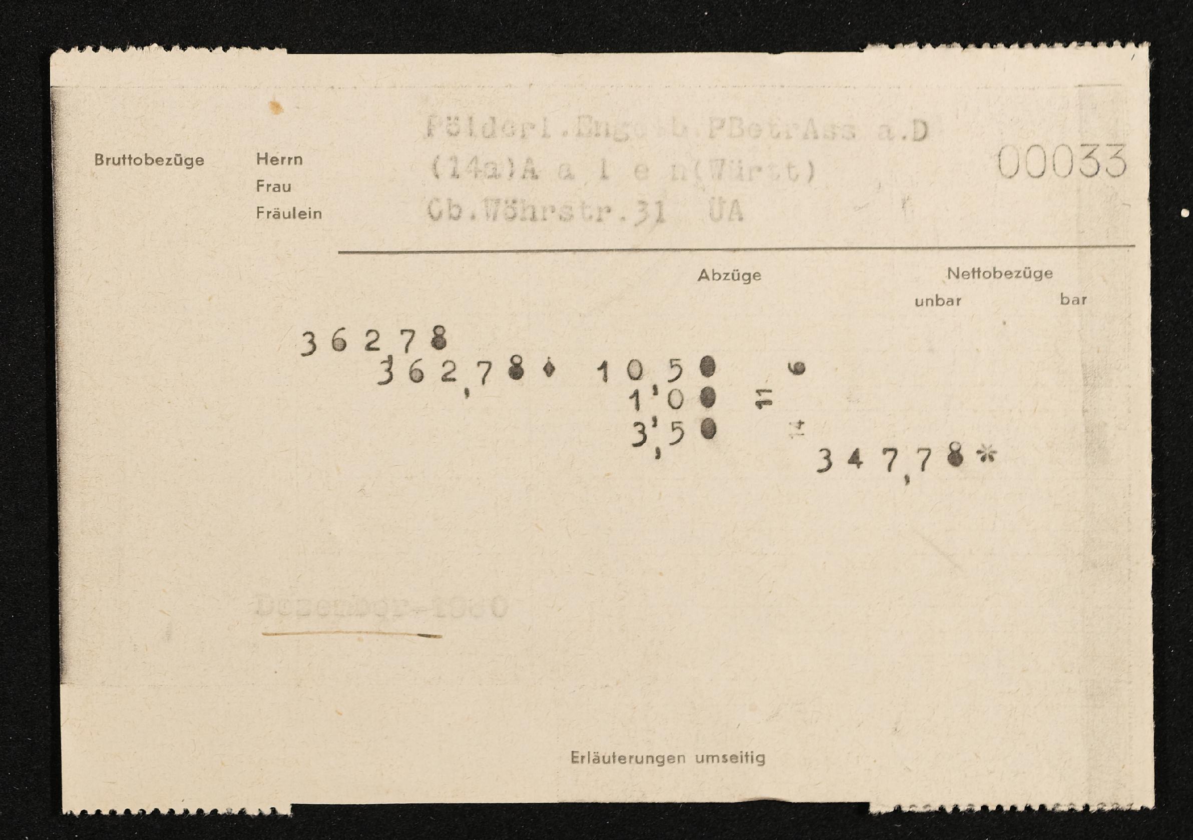 | Beschreibung | Lohnzettel, Postbetriebsassistent Engelbert Pölderl, Oberpostdirektion Stuttgart, Dezember 1960 |