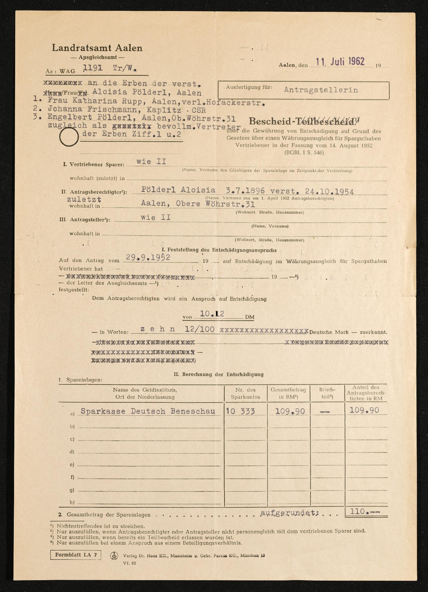 | Beschreibung | Bescheid Sparguthaben Vertriebender an die Erben der verstorbenen Aloisia Pölderl, Katharina Rupp, Johanna Frischmann und Engelbert Pölderl, Landratsamt Aalen Ausgleichsamt, 11. Juli 1962 |