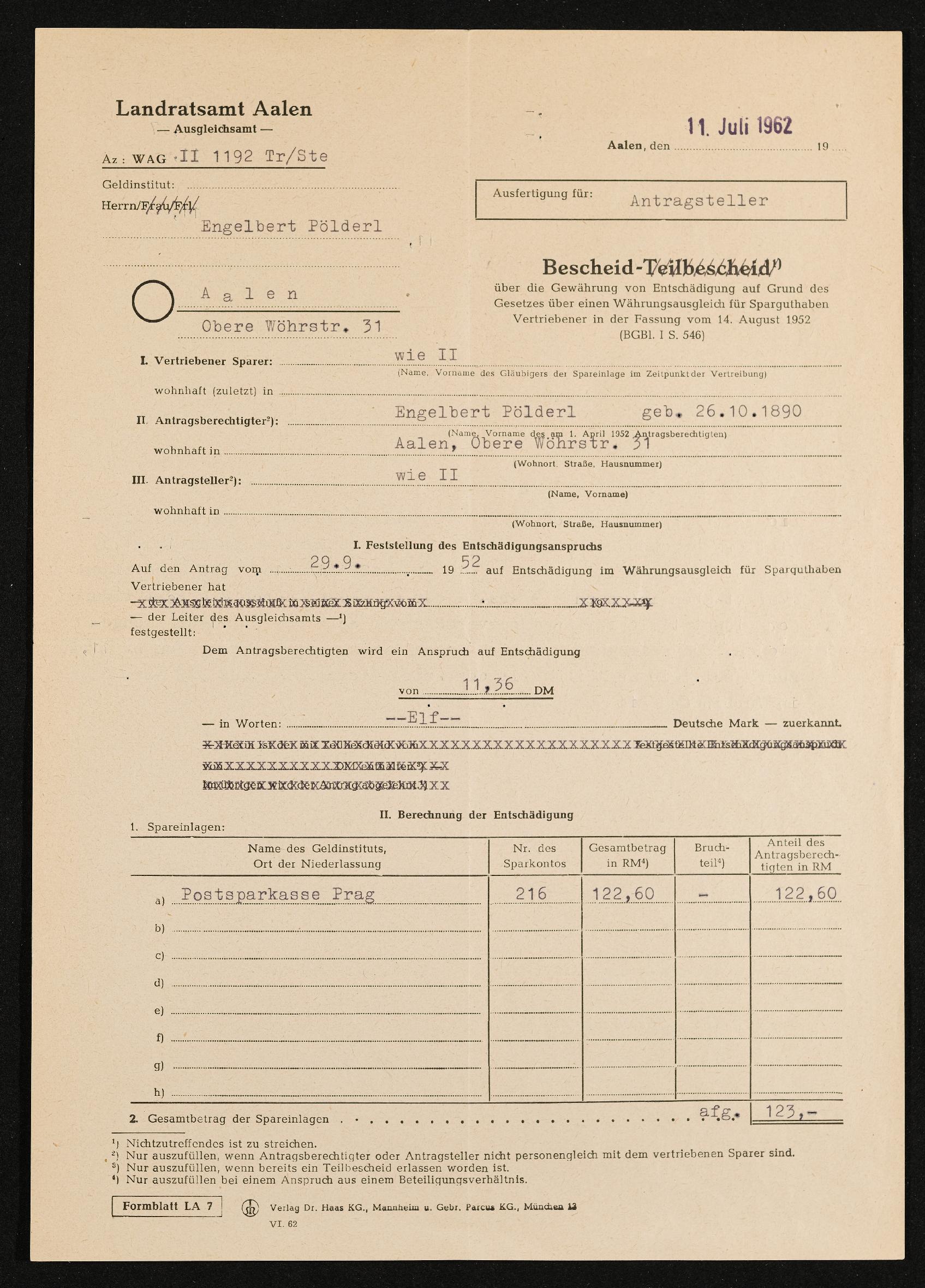 | Beschreibung | Bescheid Sparguthaben Vertriebener, Ausfertigung für Antragsteller Engelbert Pölderl, Landratsamt Aalen Ausgleichsamt, 11. Juli 1962 |