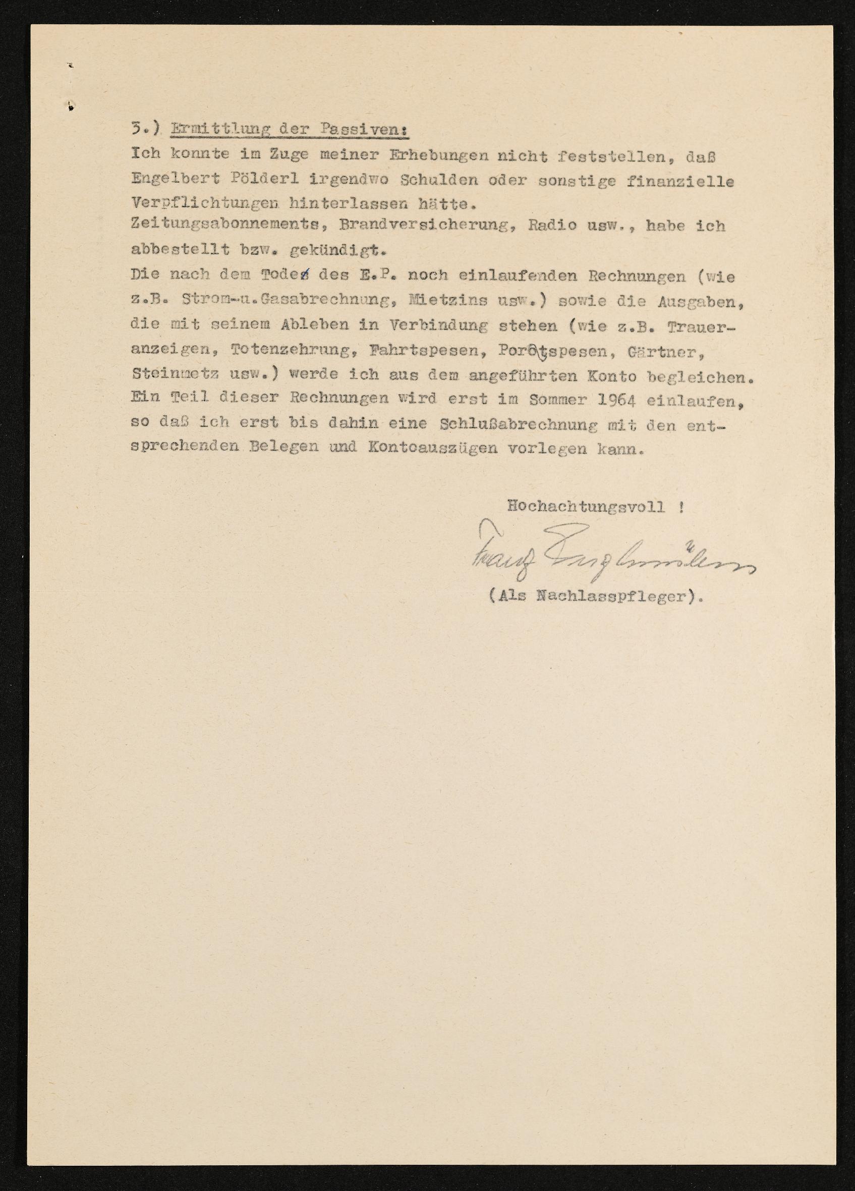 | Beschreibung | Zwischenbericht Nachlass Engelbert Pölderl, Ermittlung der Erben, Aktiven und Passiven, Linz, 14.April 1964 |