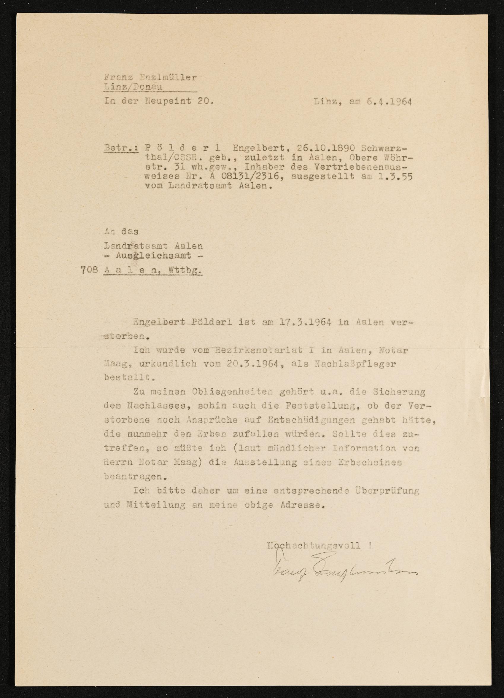 | Beschreibung | Schreiben von Franz Enzlmüller an das Landratsamt Aalen, Ausgleichsamt, betreffend Bestellung Nachlasspfleger von Engelbert Pölderl, Linz am 6. April 1964 |