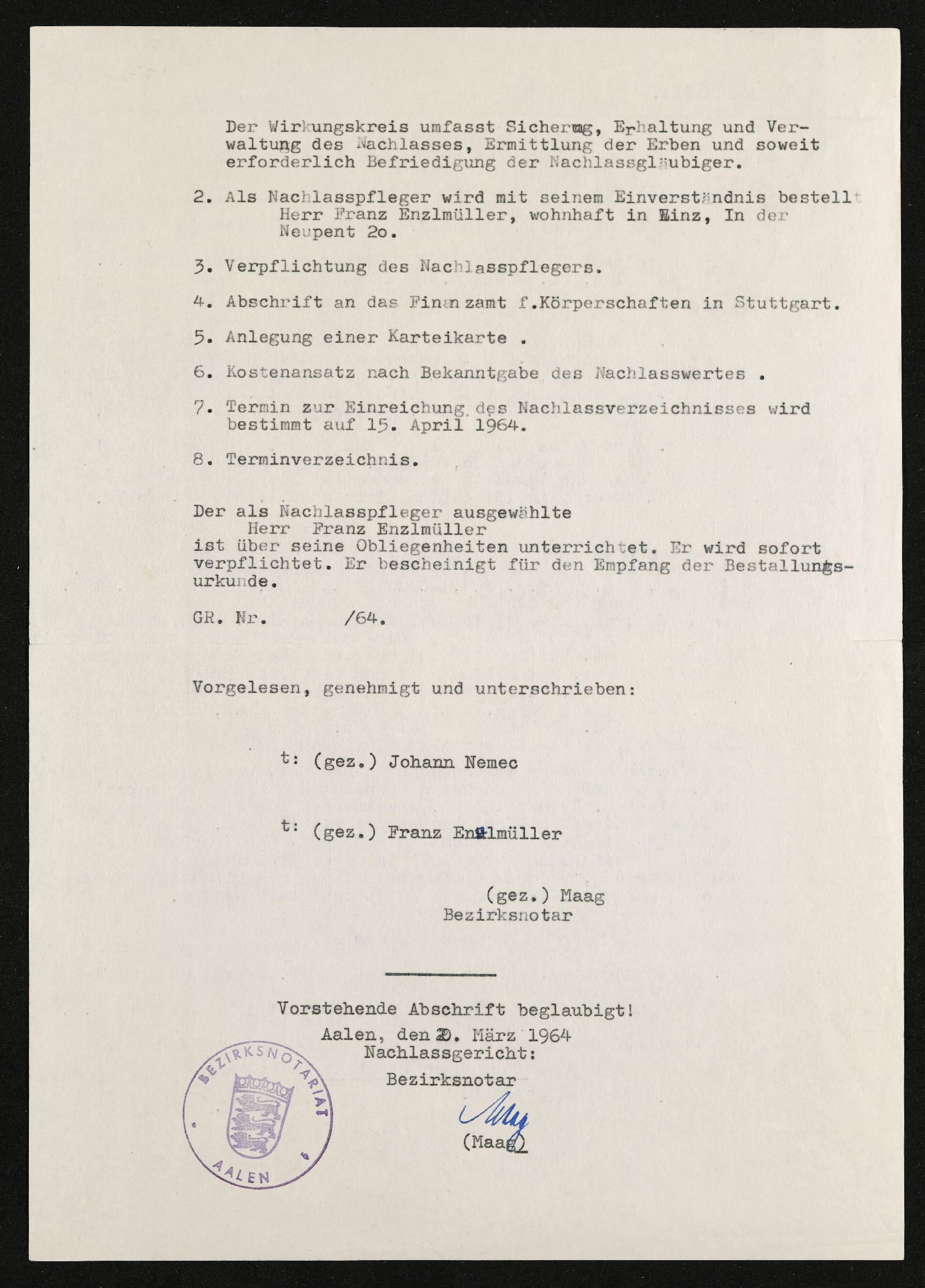 | Beschreibung | Abschrift betreffend Nachlasssache des am 17. März 1964 in Aalen verstorbenen Engelbert Pölderl, Nachlassgericht Aalen, 20. März 1964 |