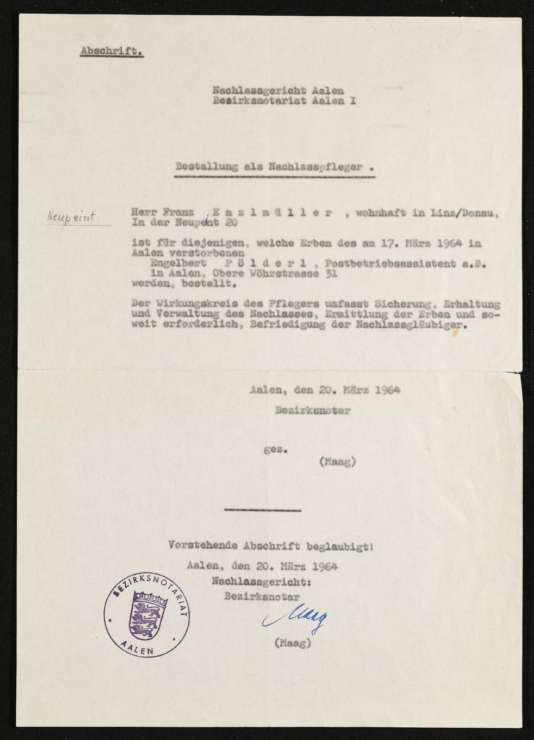 | Beschreibung | Bestellung von Franz Enzlmüller zum Nachlasspfleger betreffend Nachlasssache des am 17. März 1964 in Aalen verstorbenen Engelbert Pölderl, Abschrift Nachlassgericht Aalen, 20. März 1964 |