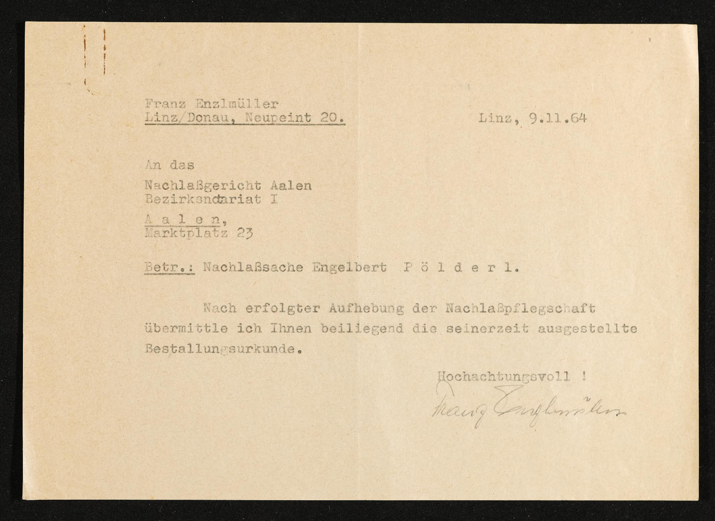 | Beschreibung | Schreiben von Franz Enzlmüller an das Nachlassgericht Aalen, Aufhebung Nachlasssache Engelbert Pölderl, Linz 9. November 1964 |