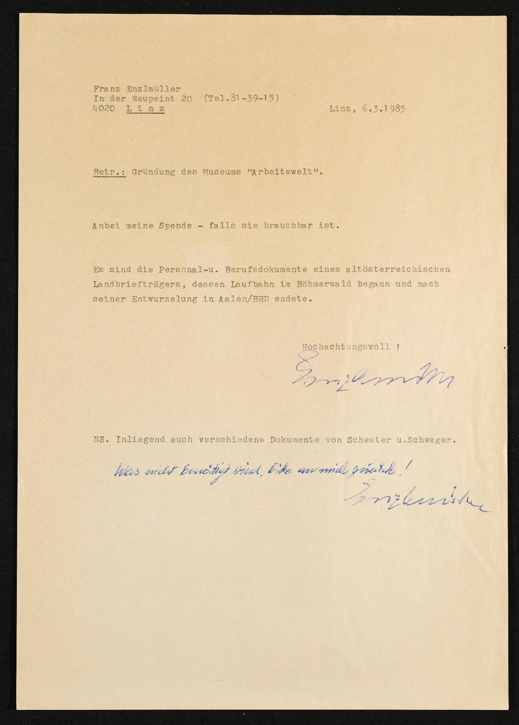 | Beschreibung | Schenkung Franz Enzlmüller an Museum Arbeitswelt, Linz, 6. März 1985 |