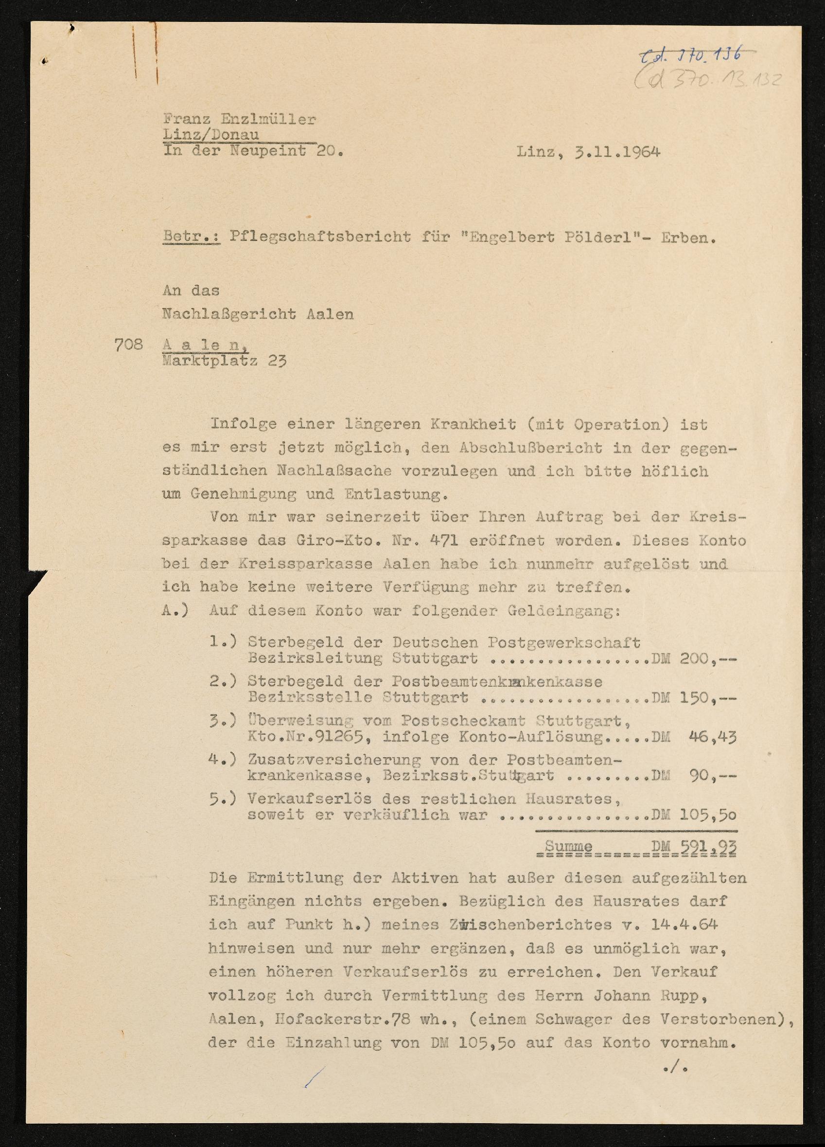 | Beschreibung | Schreiben von Franz Enzlmüller an das Nachlassgericht Aalen, betreffend Pflegschaftsbericht für die Erben von Engelbert Pölderl, Linz, 3. November 1964 |