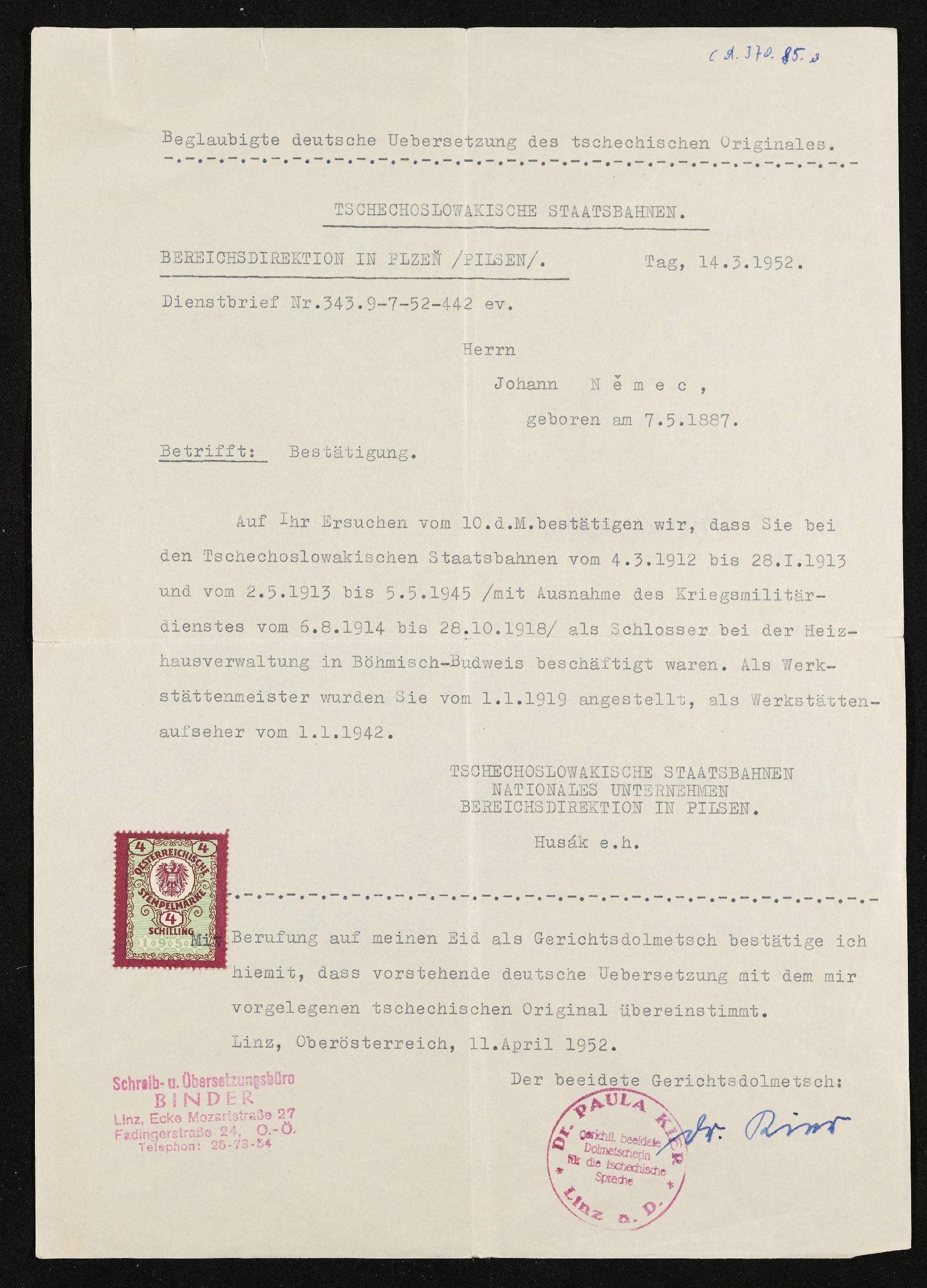 | Beschreibung | Bestätigung Dienstverhältnisse Tschechoslowakische Staatsbahnen betreffend Johann Nemec, beglaubigte deutsche Übersetzung des tschechischen Originals, Tschechoslowakische Staatsbahnen Bereichsdirektion Pilsen, 14. März 1952 |