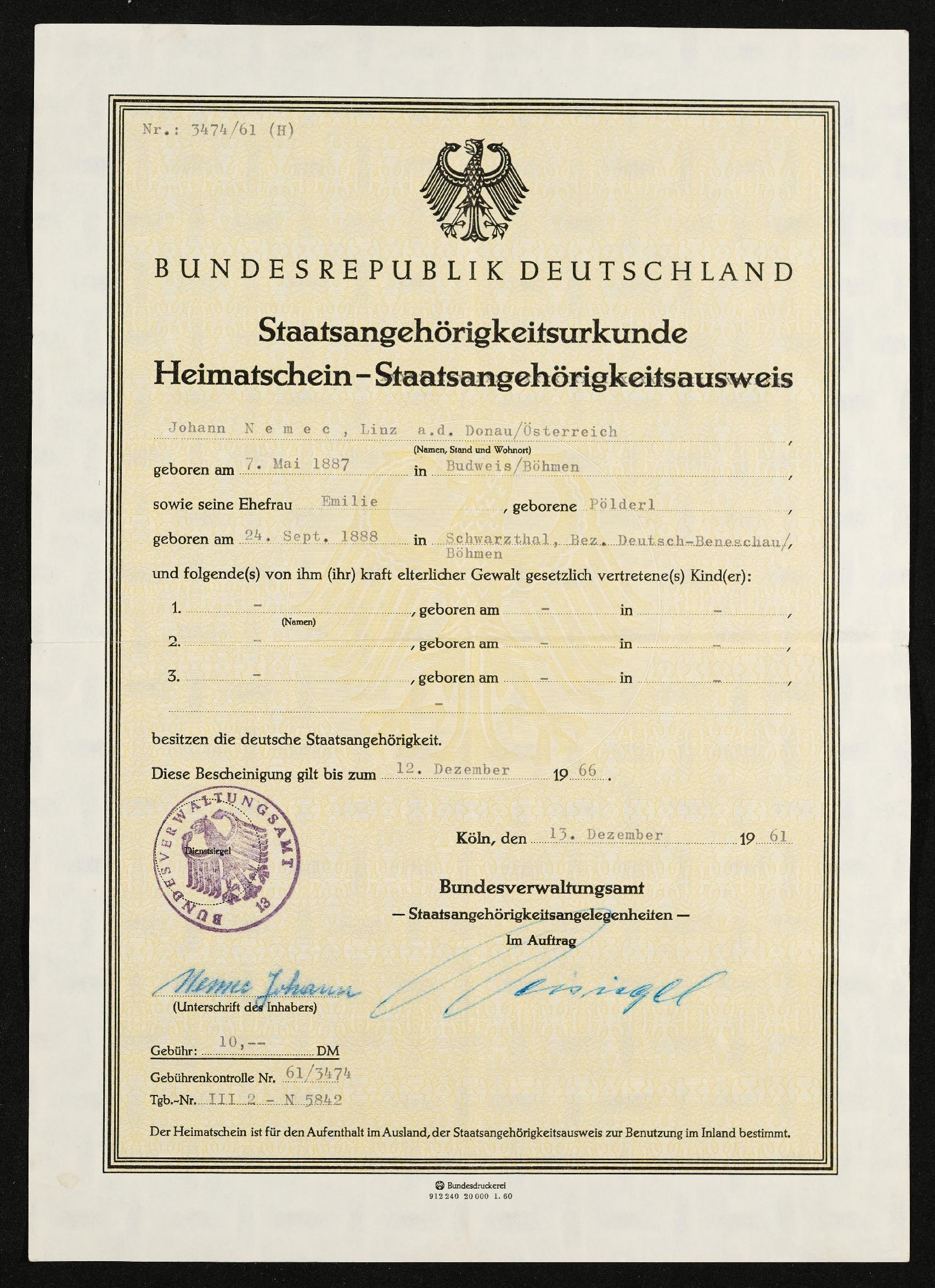 | Beschreibung | Staatsangehörigkeitsurkunde, Heimatschein-Staatsangehörigkeitsausweis, Johann Nemec, Linz a.d. Donau/Österreich, sowie seine Ehefrau Emilie geb Pölderl, ausgestellt vom Bundesverwaltungsamt Köln am 13. Dezember 1961 |