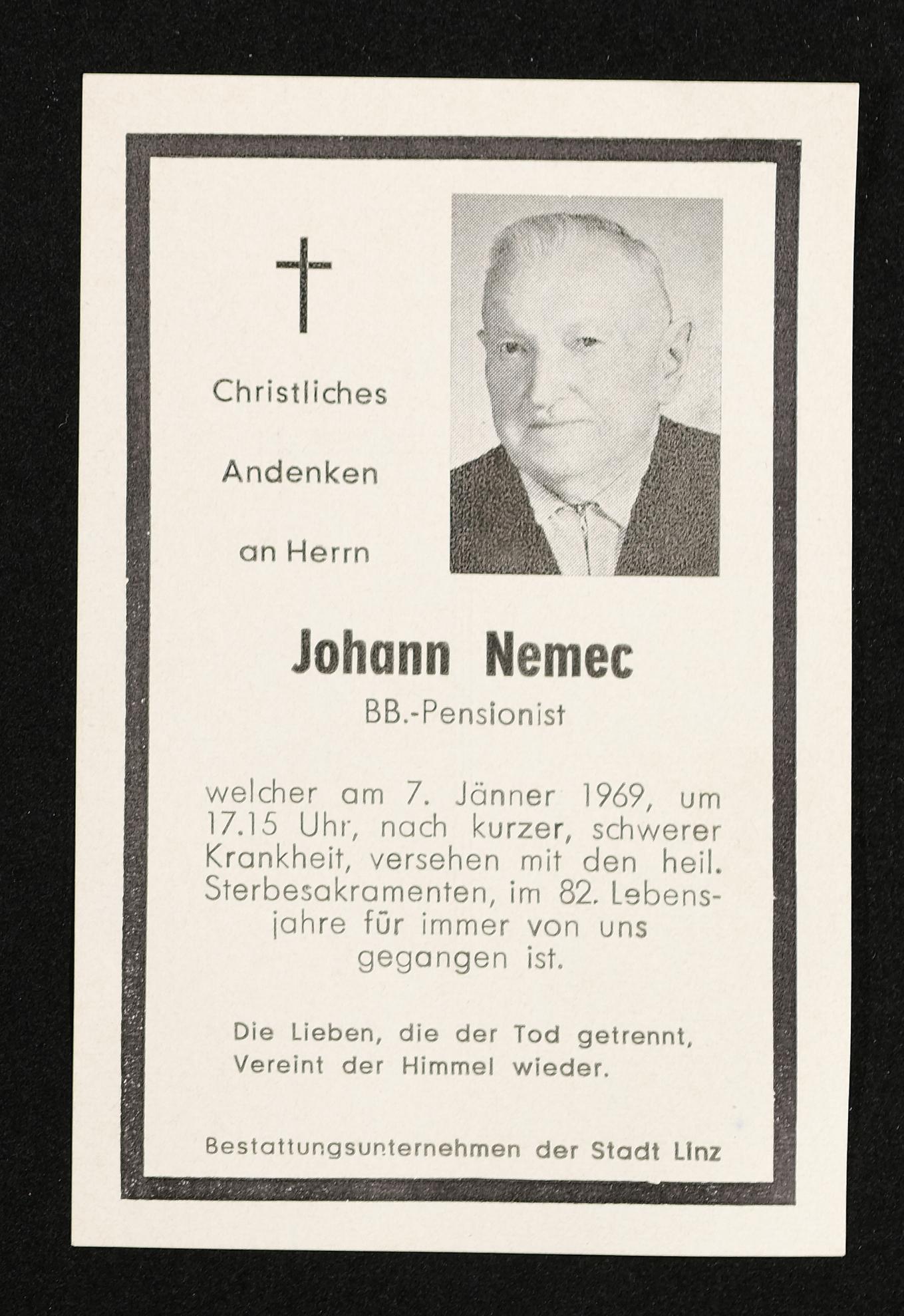 | Beschreibung | Partezettel Johann Nemec, Bundesbahn-Pensionist, verstorben am 7. Jänner 1969 |