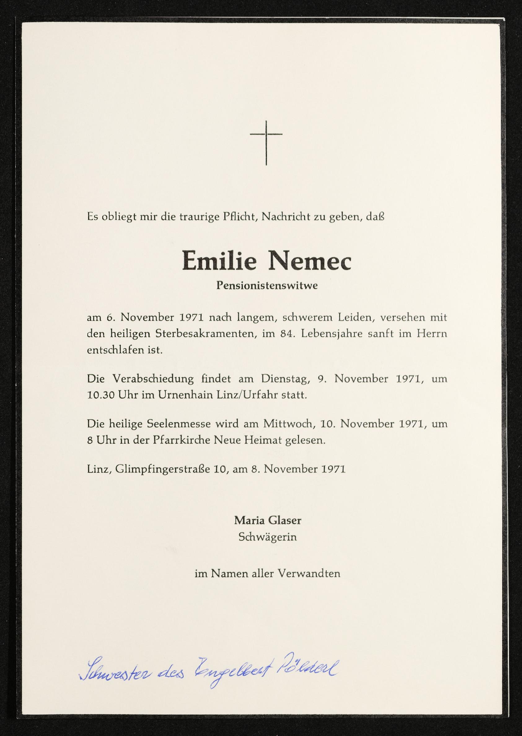| Beschreibung | Partezettel Emilie Nemec, Pensionistenwitwe, verstorben am 6. November 1971 |
