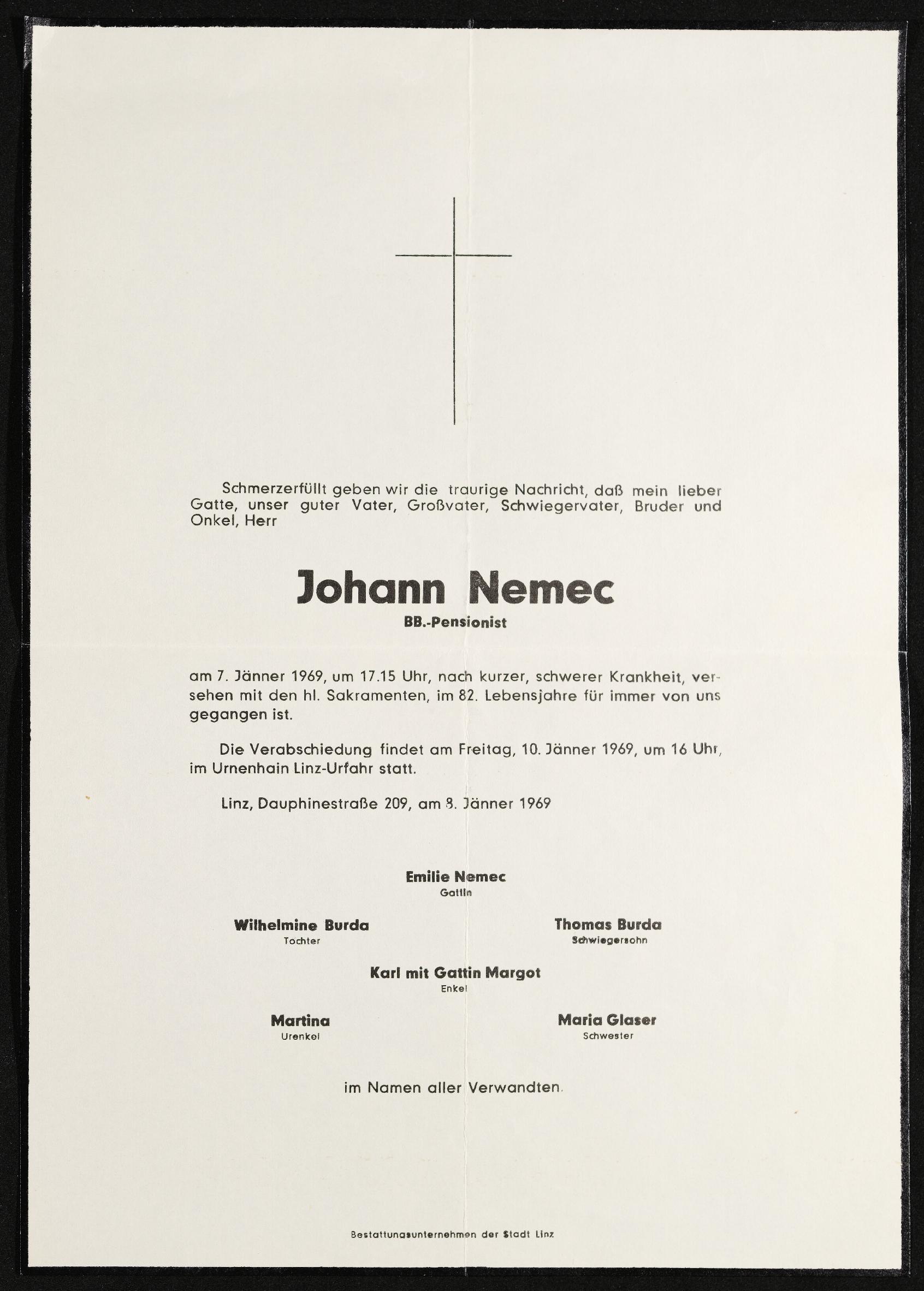 | Beschreibung | Partezettel Johann Nemec, Bundesbahn-Pensionist, verstorben am 7 .Jänner 1969 |