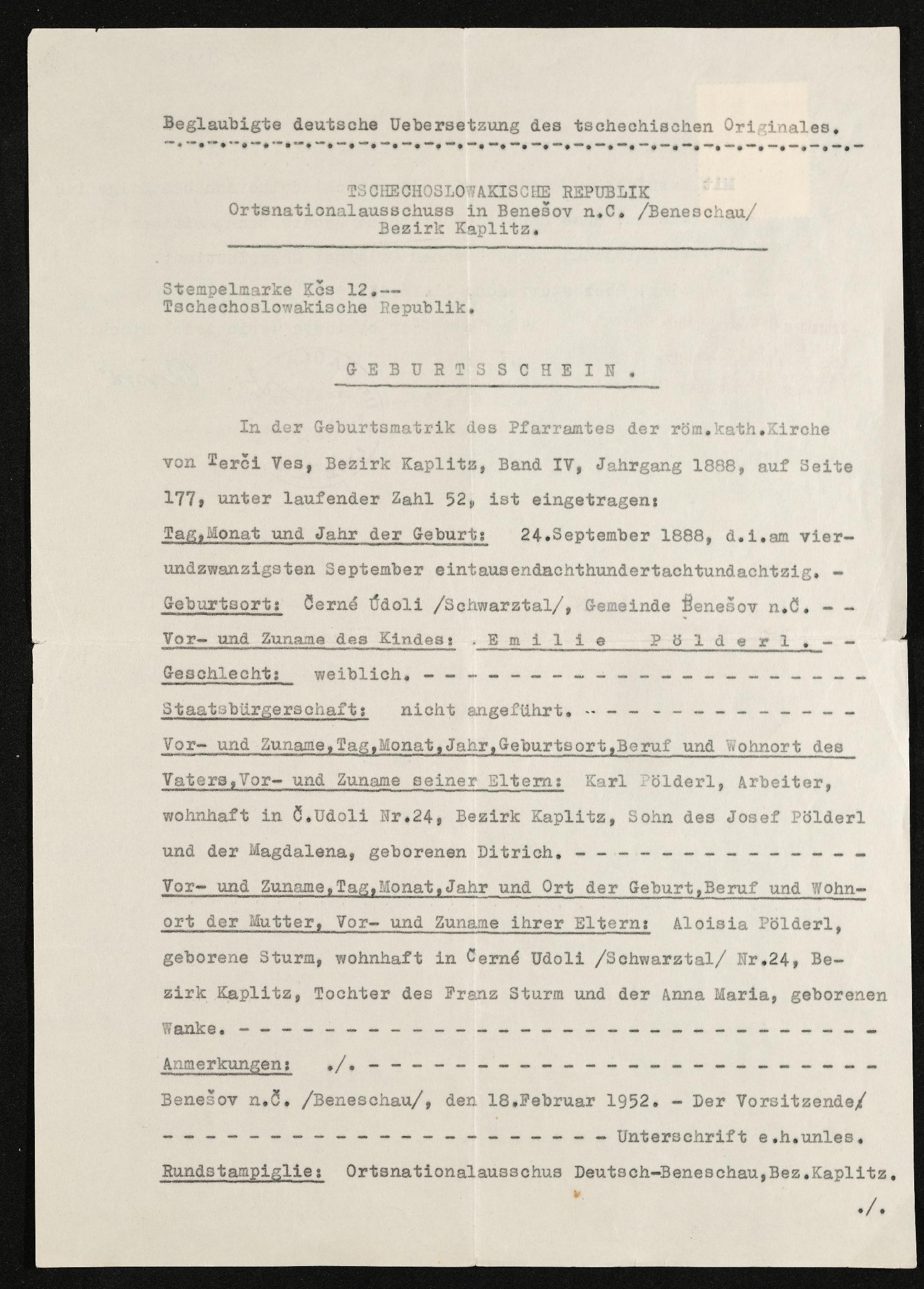 | Beschreibung | Geburtsschein Emilie Pölderl, beglaubigte deutsche Übersetzung des tschechischen Originals, Linz, 11. April 1952 |