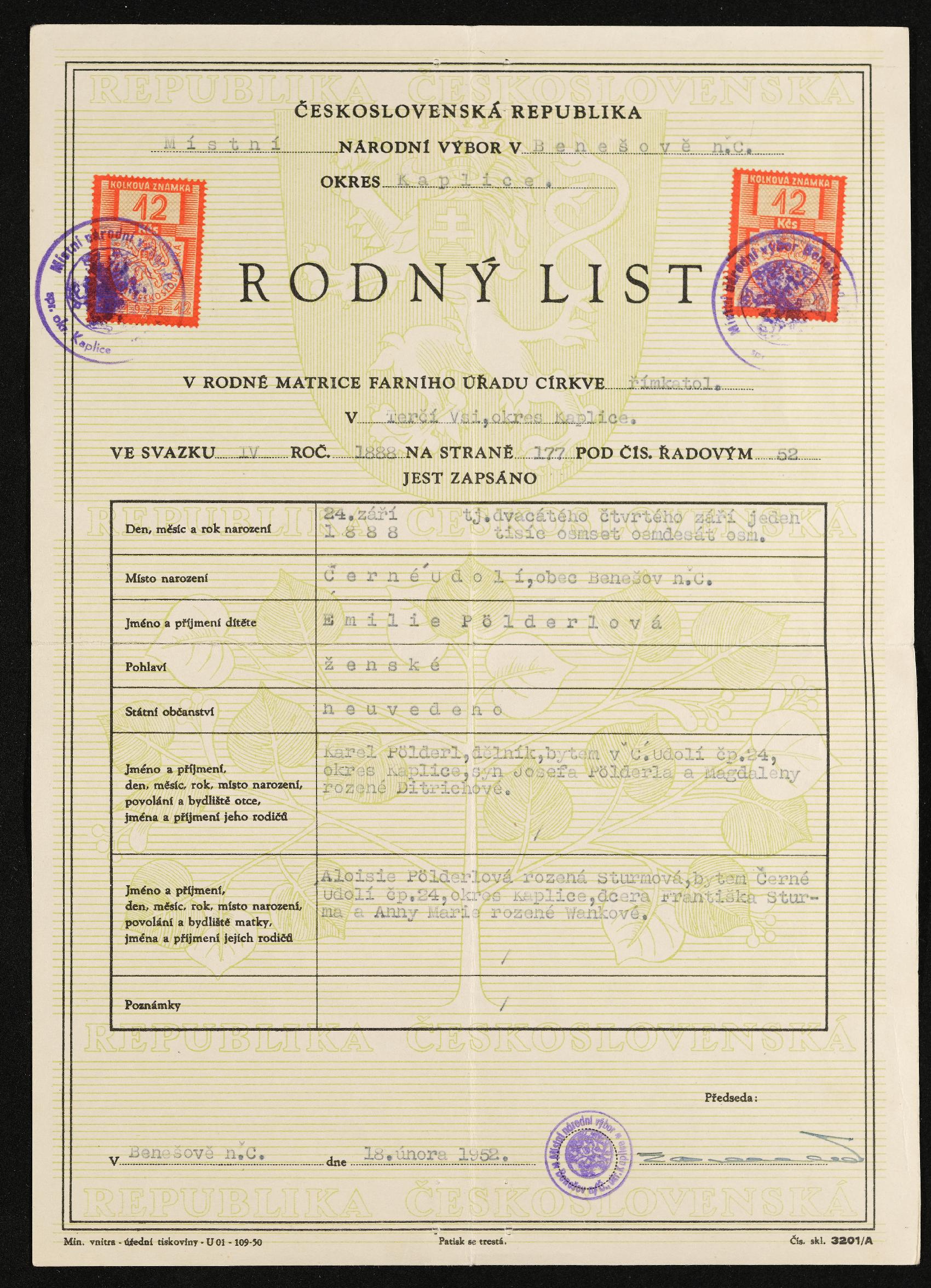 | Beschreibung | Geburtsurkunde Emilie Pölderlova, geboren am 24. September 1888 in Benesove n.c., ausgestellt am 18. Februar 1952 |