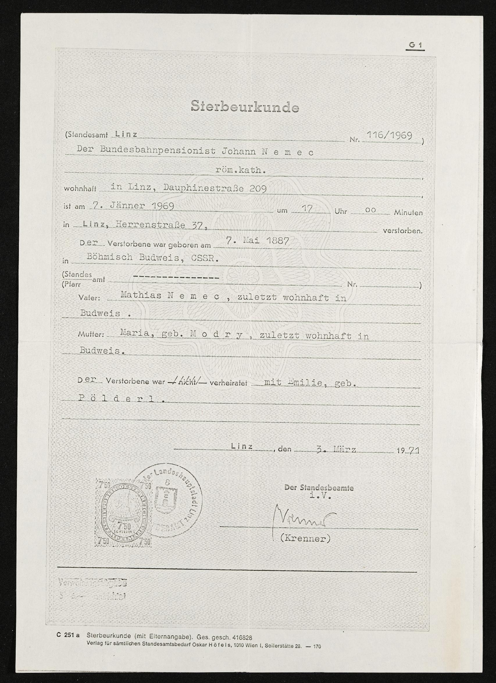 | Beschreibung | Sterbeurkunde Johann Nemec, Bundesbahn-Pensionist, verstorben am 7. Jänner 1969, ausgestellt vom Standesamt Linz am 3. März 1971 |