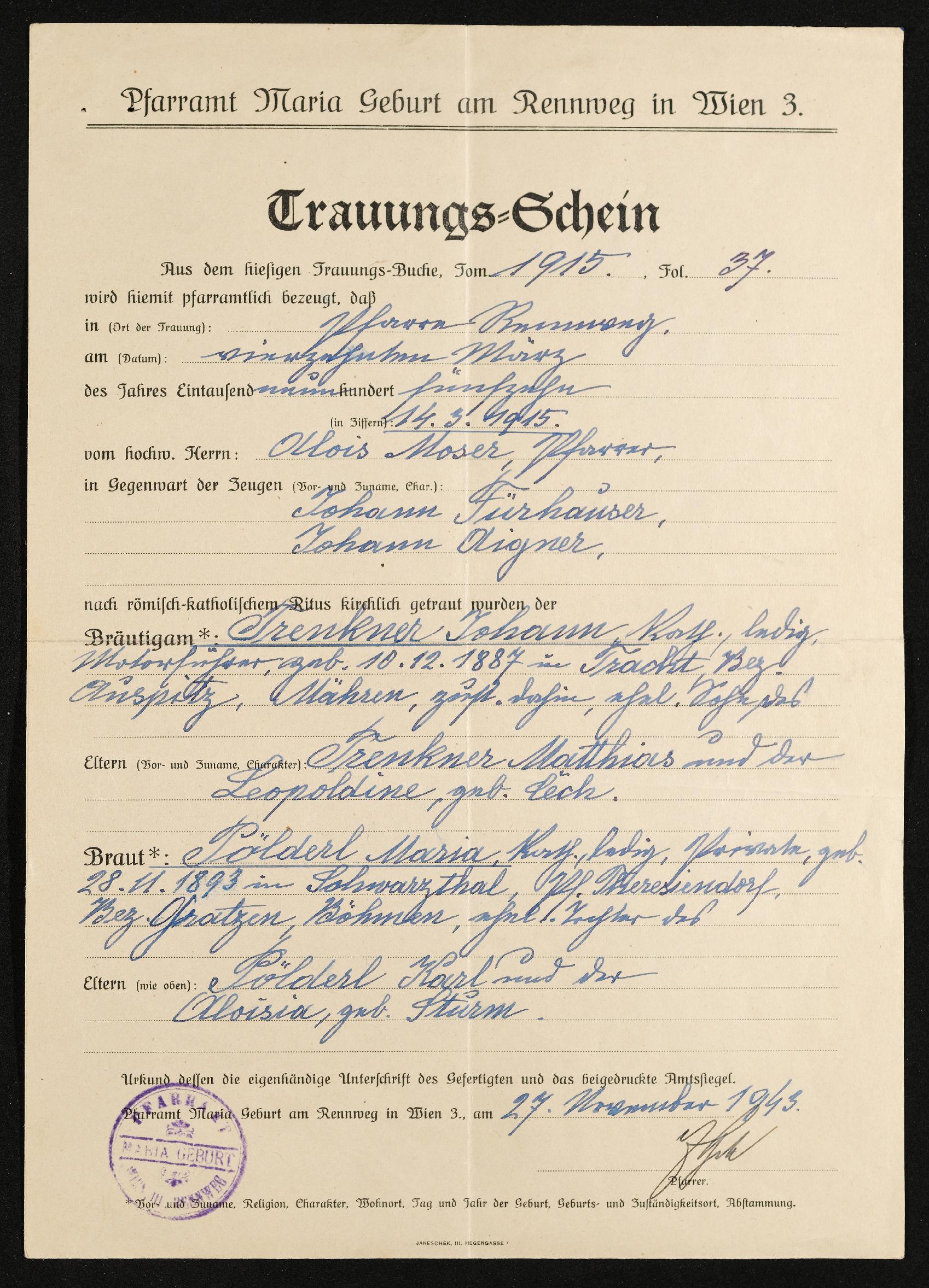 | Beschreibung | Trauungsschein Maria Pölderl, Pfarramt Maria Geburt am Rennweg in Wien, 27. November 1943 |