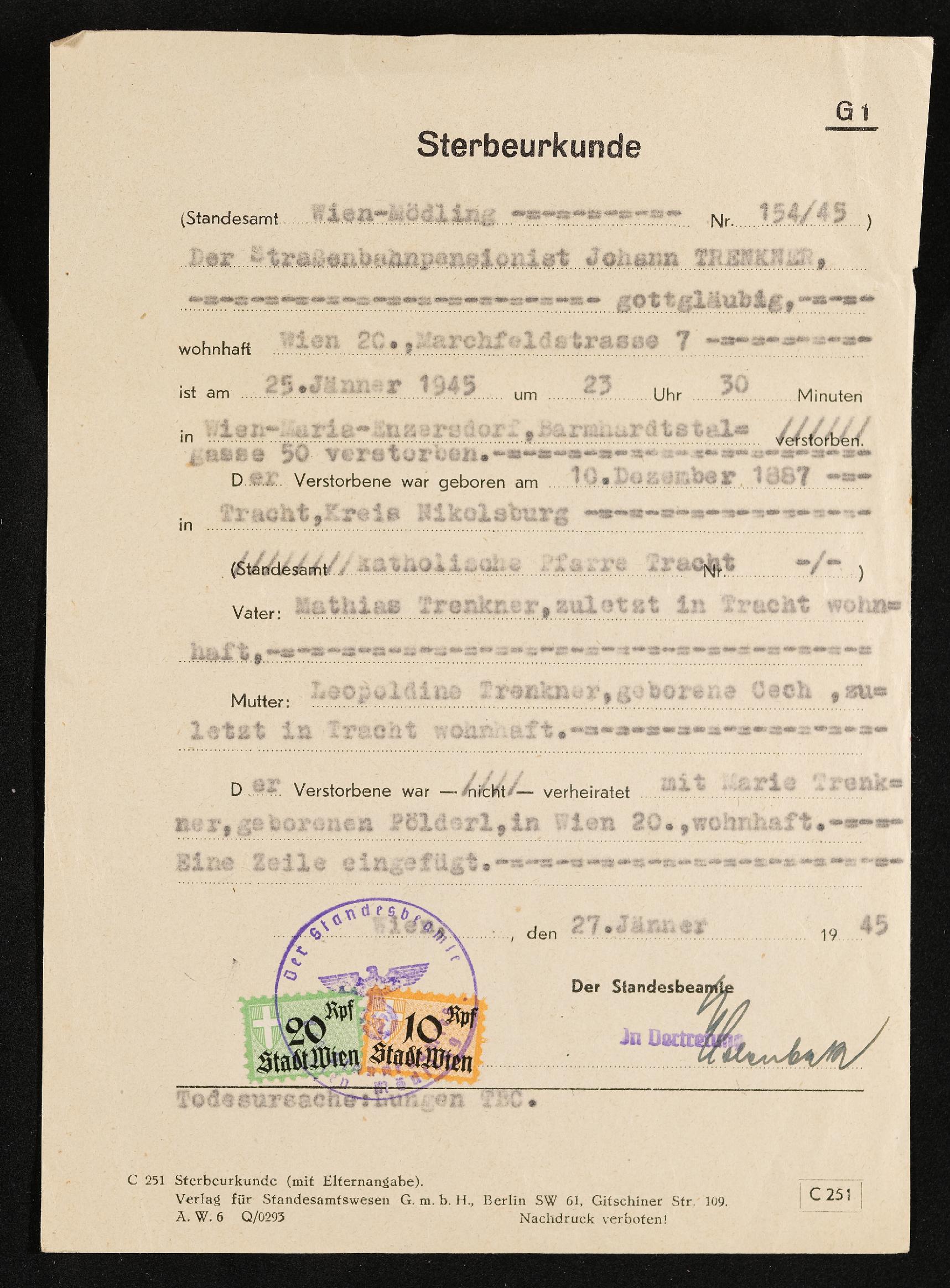 | Beschreibung | Sterbeurkunde Straßenbahnpensionist Johann Trenkner, verstorben am 25. Jänner 1945, Wien, 27. Jänner 1945 |