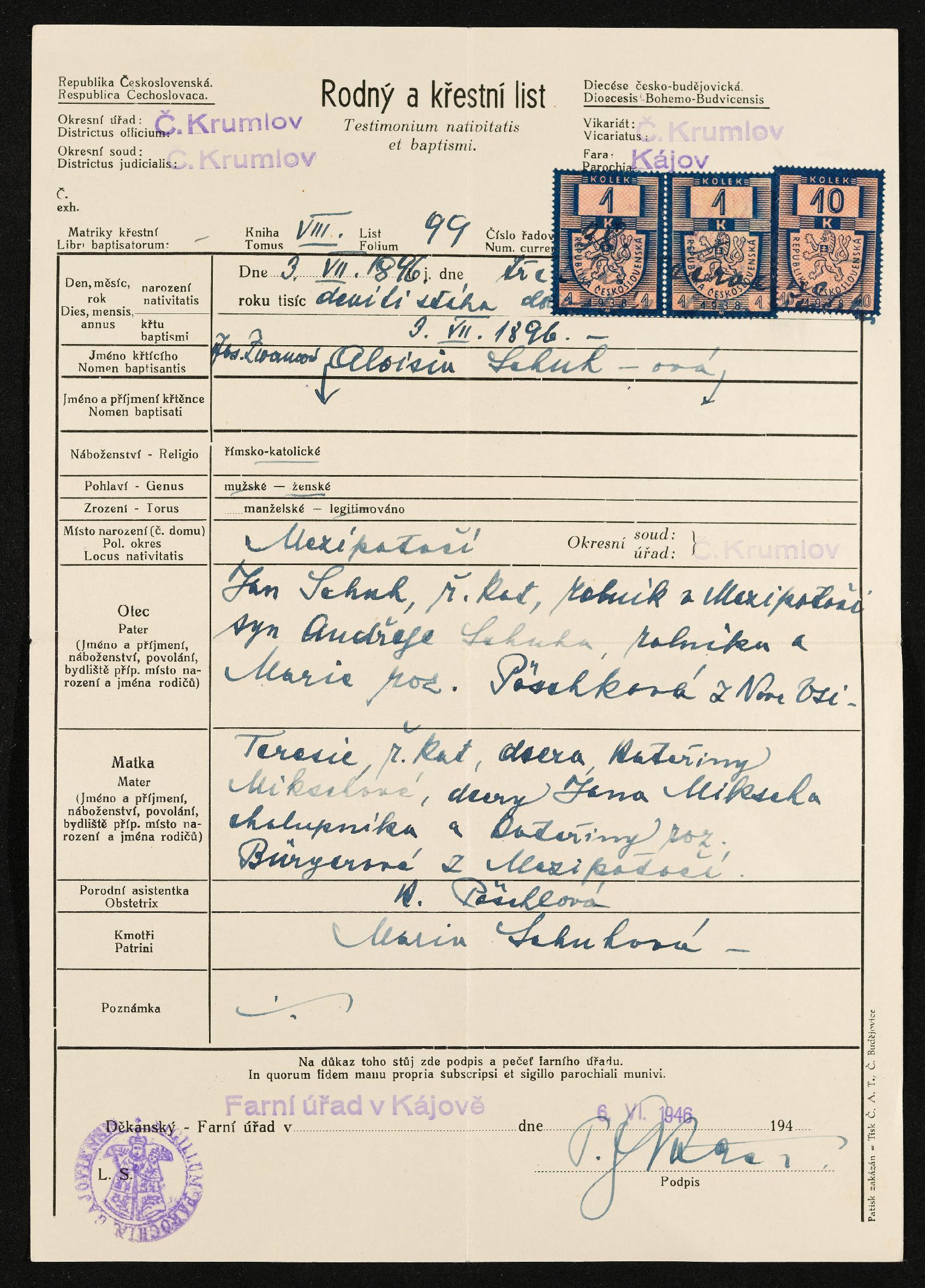 | Beschreibung | Geburtsurkunde Aloisia Schuh, geboren am 3. Juli 1896, ausgestellt am 6. Juni 1946 |